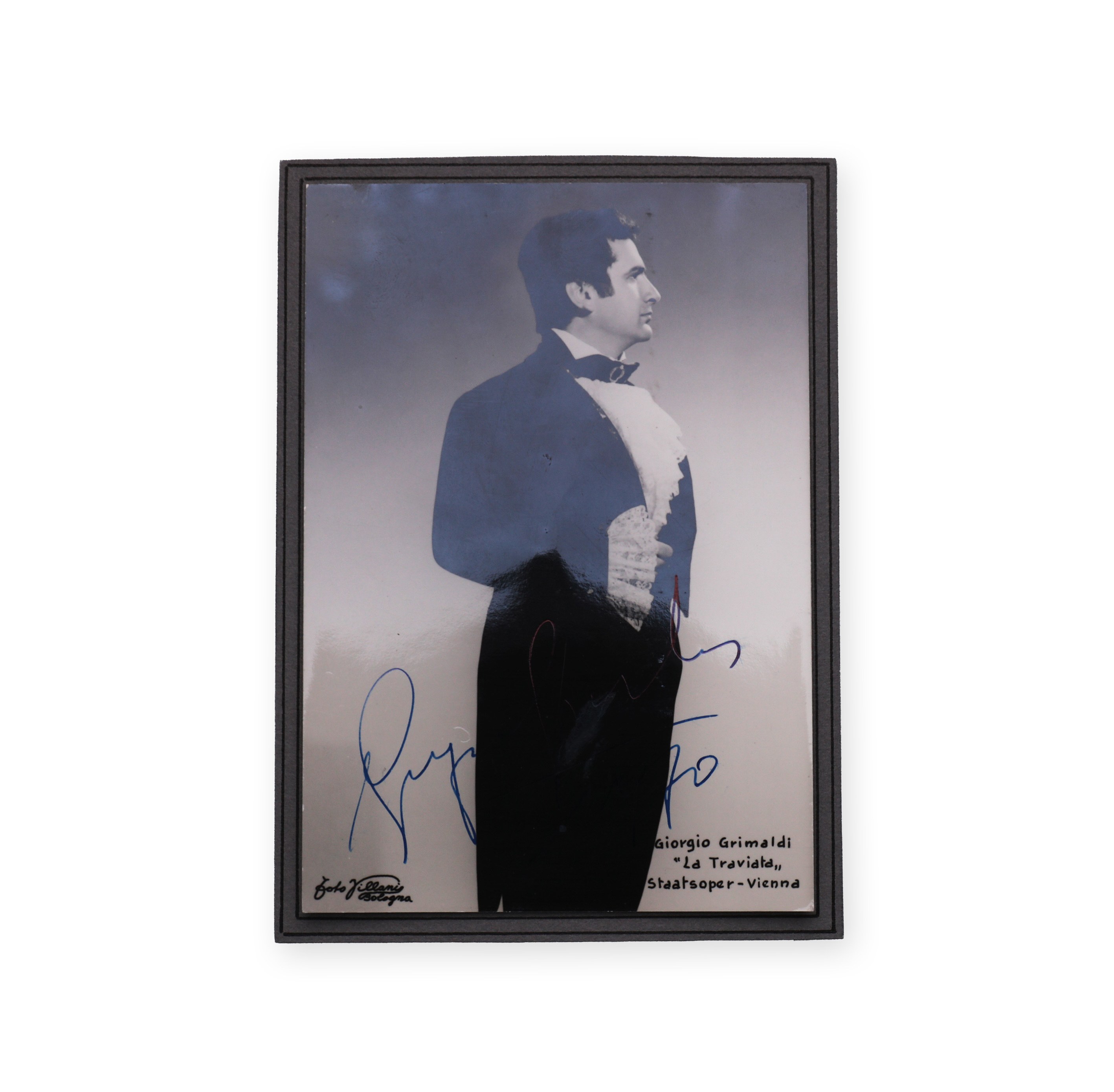 Photo of Italian singer Giorgio Grimaldi from 1970 with hand-signed full name, printed name directly on the photo and handwritten date. Giorgio Grimaldi, an operatic baritone active mainly in the second half of the 20th century, was valued for his rich voice and distinctive stage charisma, which he used in classical and modern repertoire on European stages.___________________________________________________________________________