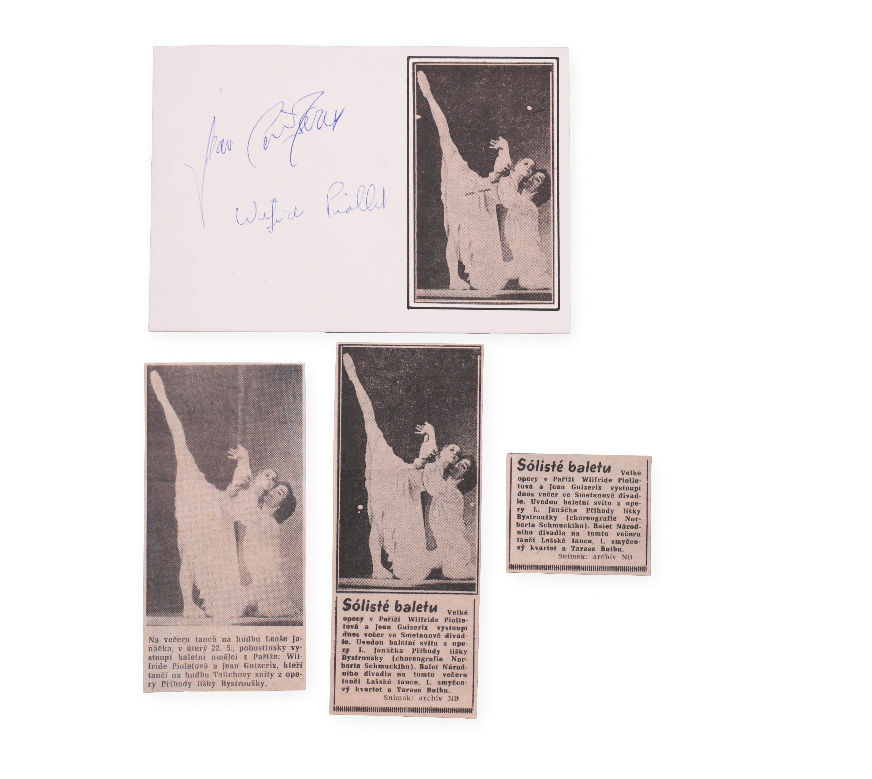 Signed autograph card of the French singer Piollet and her husband, the conductor Marc Piollet, complete with a photo of them together and three newspaper clippings with information about her career. Piolletová, was active in the second half of the 20th century, while Marc Piollet established himself as an internationally recognized conductor working on a number of prestigious European stages.___________________________________________________________________________