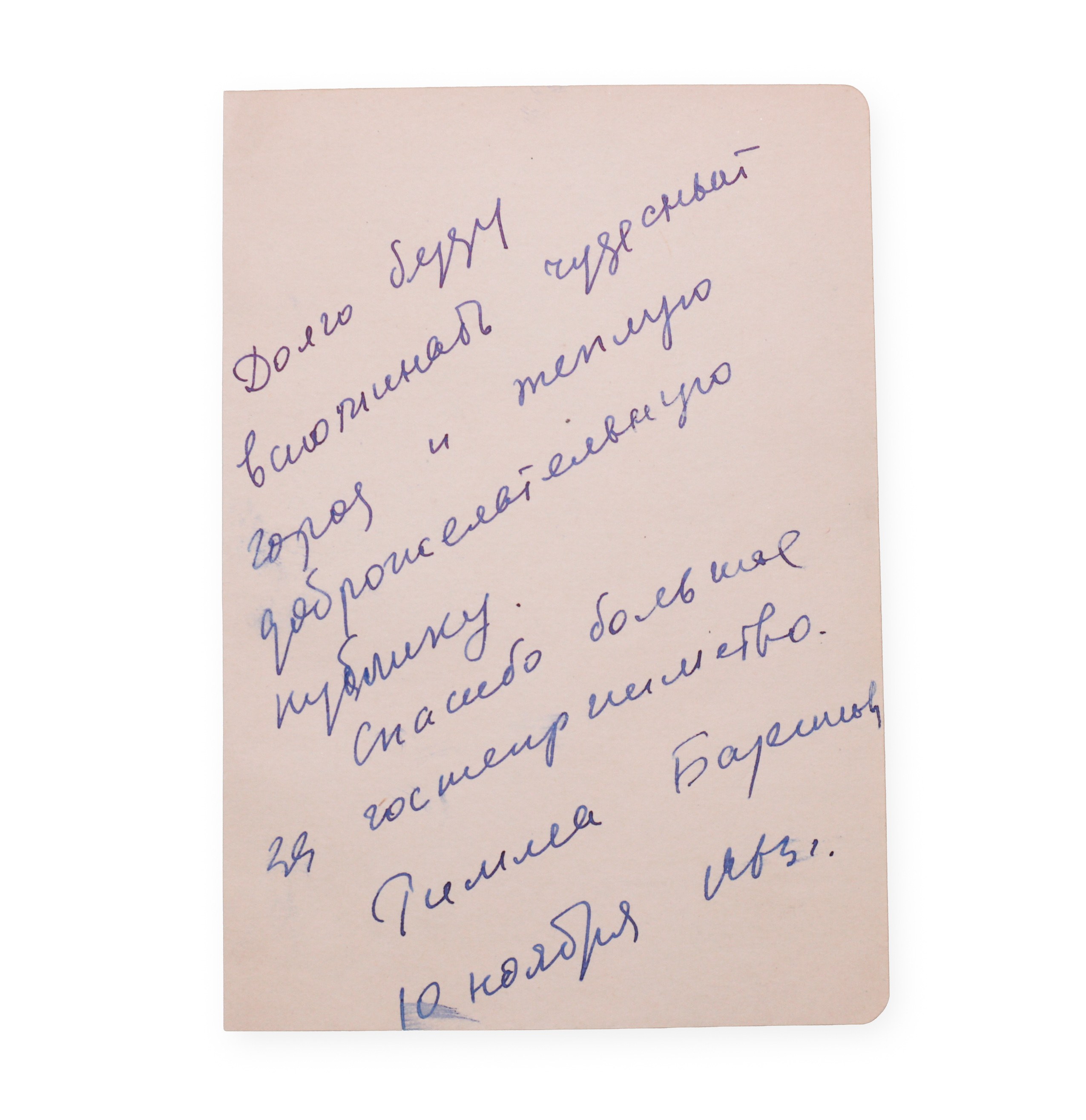 Handwritten letter in Russian signed by Rimma Andreevna Barinova, Soviet lyric soprano opera singer. She was characterized by a cultivated voice, a dramatic sense and a deep expression, with which she portrayed a number of roles in the classical and Soviet repertoire. Her singing career was closely connected with theater scenes in Russia, where she worked as a respected performer and teacher.___________________________________________________________________________