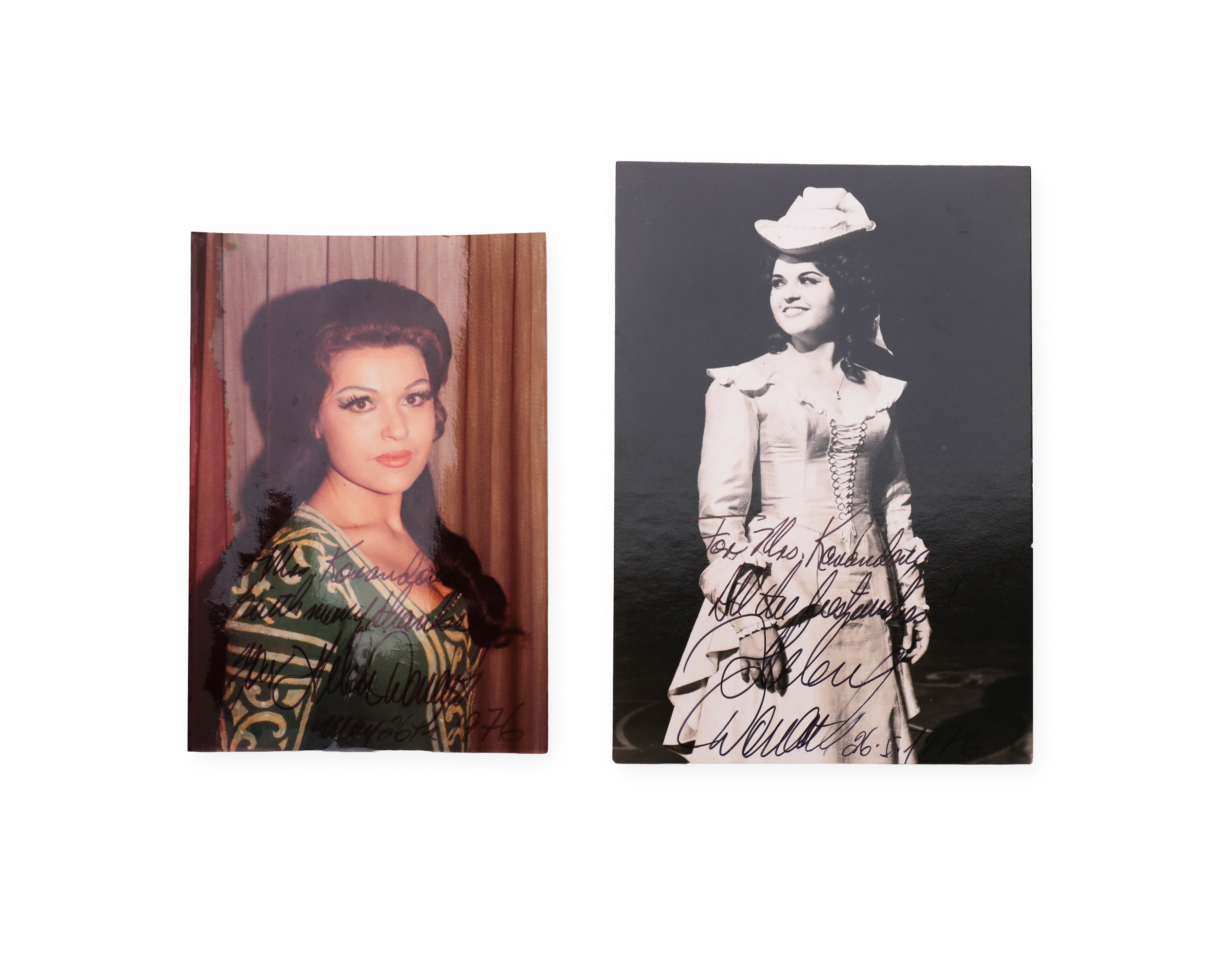 A set of two photographs of the personality with handwritten dedications and signatures, one in color and the other in black and white. Helen Donath is an American soprano who has made a name for herself on the world's leading opera stages, including the Salzburg Festival, the Vienna State Opera and the Metropolitan Opera in New York. He is best known for his interpretations of Mozart and German romantic repertoire.___________________________________________________________________________