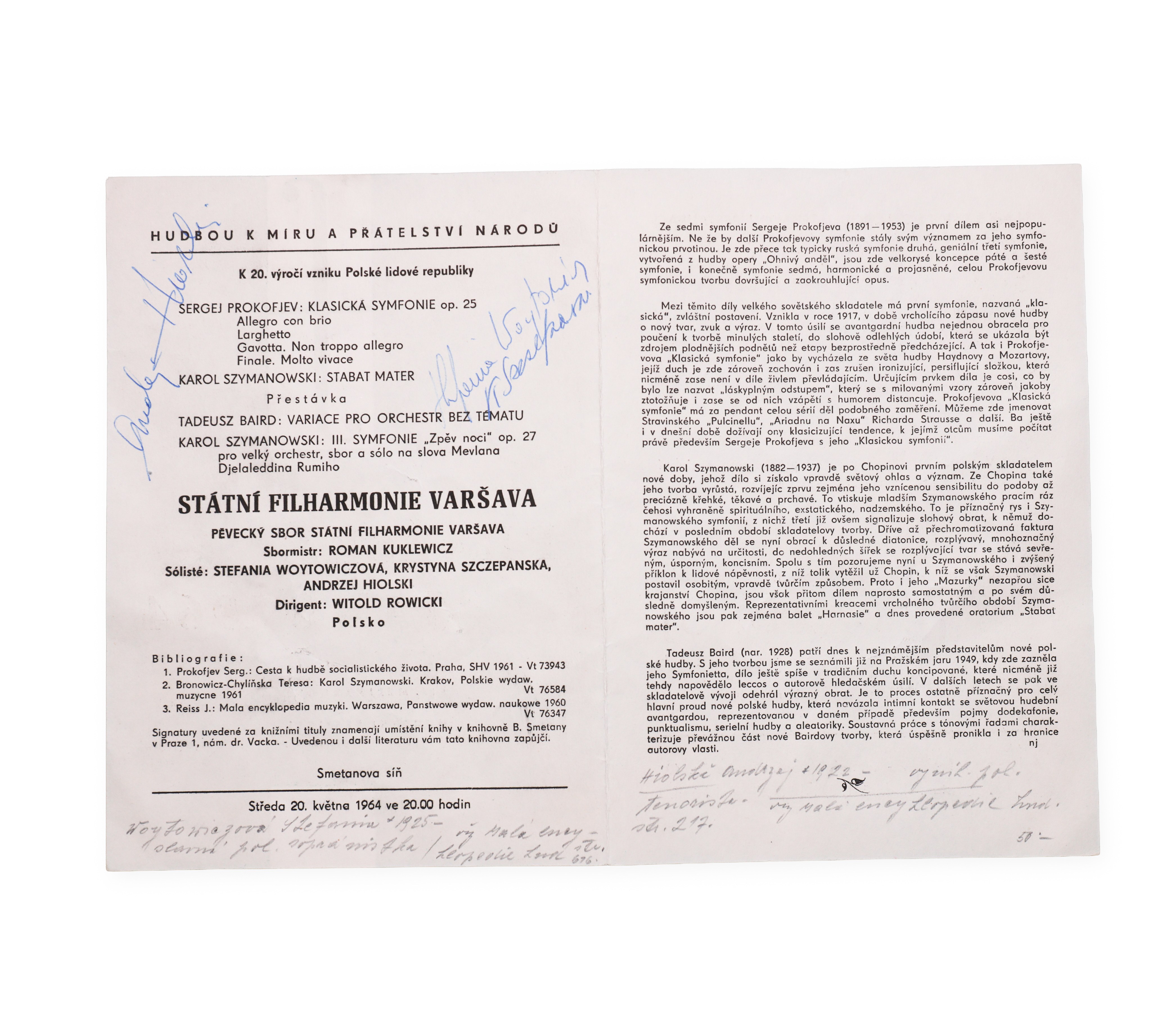 Program for the Prague Spring festival concert held on May 20, 1964, with the handwritten signatures of both performing artists – baritone Andrzej Hiolský and soprano Stefania Woytowicz – with their full names. Andrzej Hiolski was a prominent figure on the Polish opera scene, valued for his cultivated voice and dramatic expression, while Stefania Woytowicz was one of the leading Polish sopranos of her time, known for her interpretative depth and collaboration with a number of European orchestras.___________________________________________________________________________