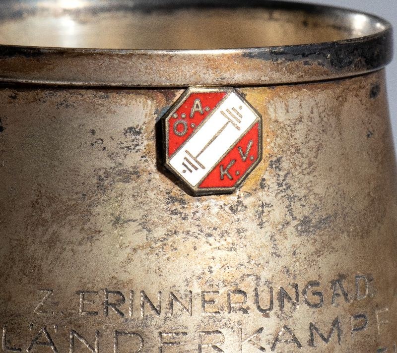 Small cup for heavy athletics tournament between the national teams ITALY and AUSTRIA in July 1952. With engraving on the body of the cup. Height approximately 20 cm. To be cleaned