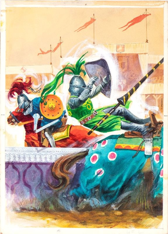 Original sketch for the poster of the 1972 Italian re-edition IVANOHE. Film directed by Richard Thorpe, with Robert Taylor, Liz Taylor, Joan Fontaine, George Sanders, Emlyn Williams. Pencil and oil on cardboard. Signed L.CROVATO vertically on the right. In excellent condition, measures 34x48 cm