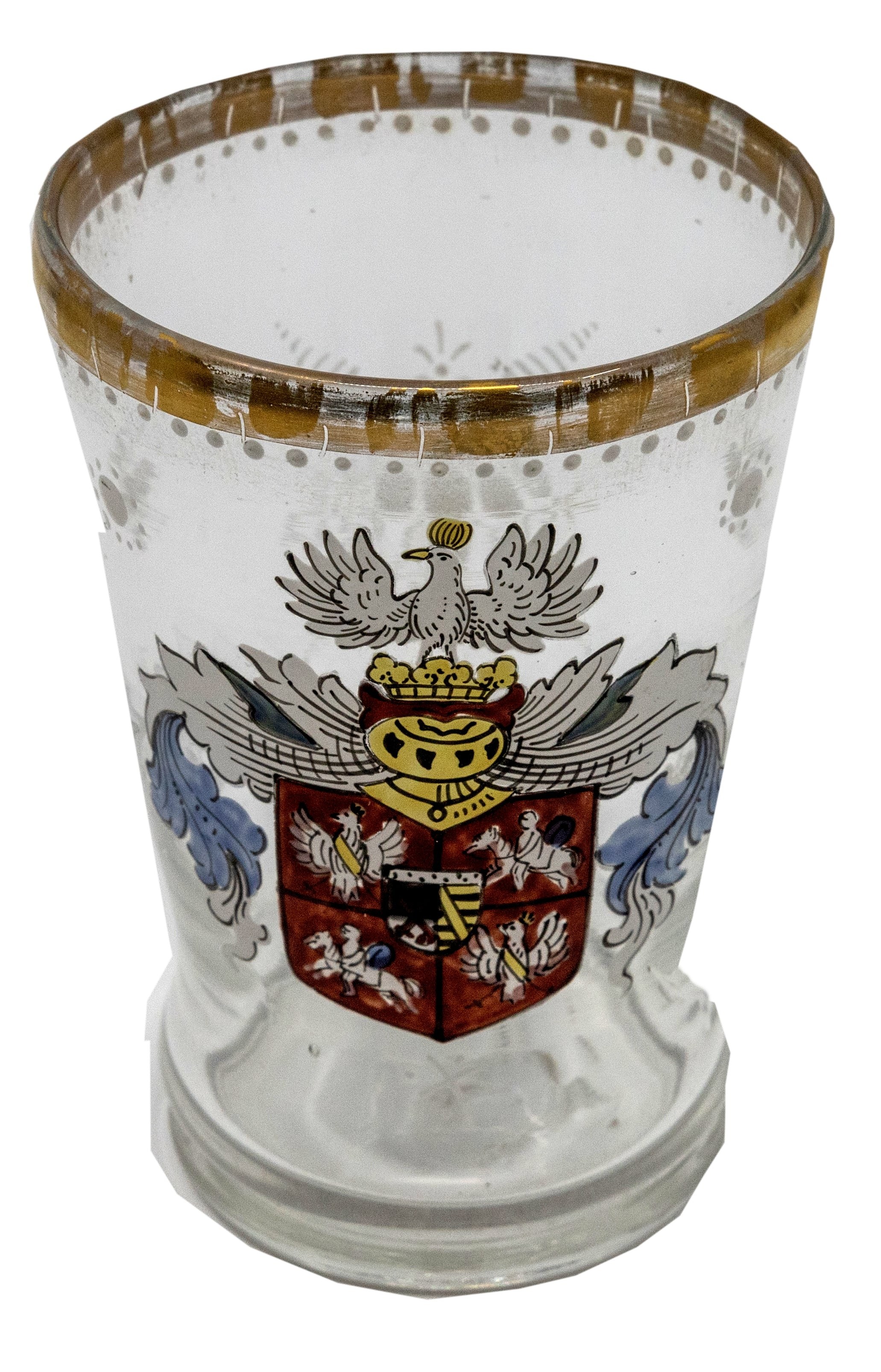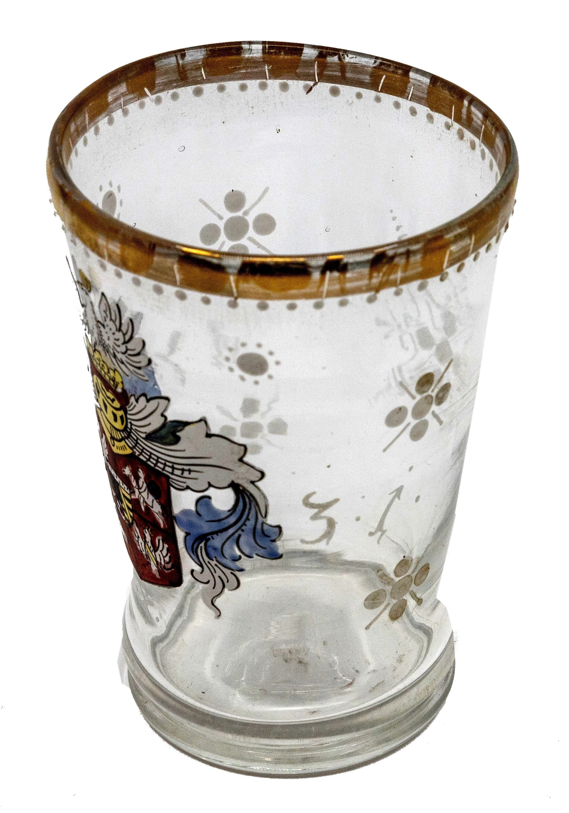 Stiklas, emalis, auksavimas. Matmenys: aukštis – 10,5 cm.