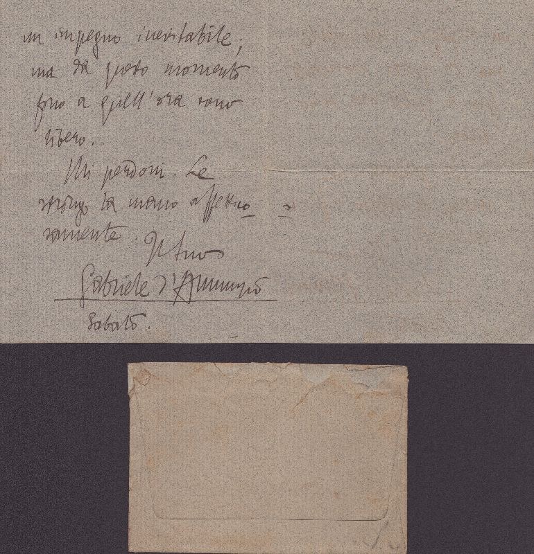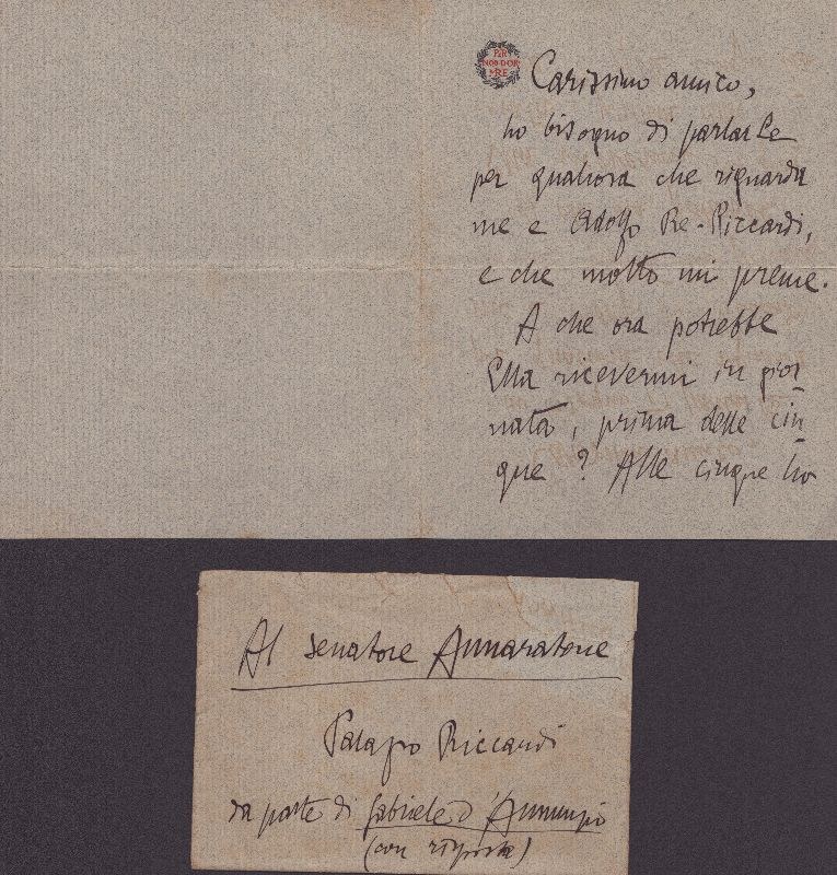 Gabriele d'Annunzio (Pescara, 12 March 1863 – Gardone Riviera, 1 March 1938) one-sheet letter, four sides with two handwritten sides, with envelope addressed to "Senator Annaratone - Palazzo Riccardi - by Gabriele d'Annunzio (with response) " where the Pope invites the Senator to meet him to discuss some matters concerning his friend Adolfo Re Riccardi, a theater impresario. Angelo Annaratone (Frascarolo, 23 August 1844 - Rome, 21 August 1922) was a Garibaldi supporter who fought at Monte Suello and against Carmine Crocco in the South. He was then prefect of Brescia, Livorno, Florence and Rome and in 1905 he rose to the Senate. Letter with motto PER NON SLEEP, central fold, the front measures 17x13.5 cm