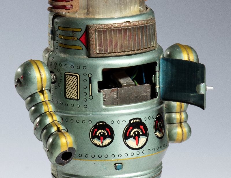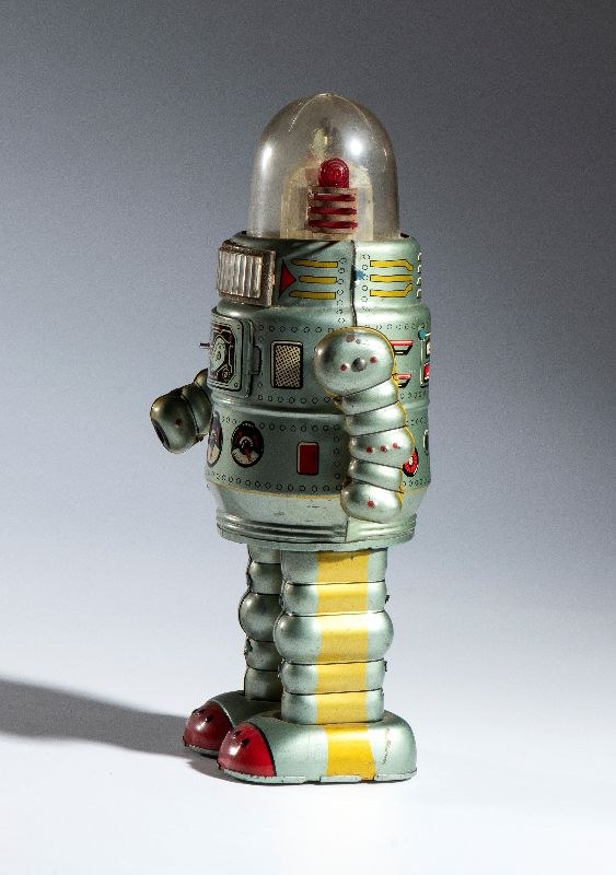 Lithographed tin robot, made in Japan, ALPS. Known as the DOOR ROBOT.Originally equipped with a wire guide and battery compartment, the model for sale is unfortunately missing the wire guide and hard rubber hands.Untested for operation. Original from the 1960s. Height approximately 24 cm.