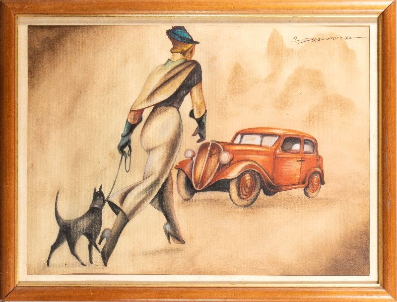 Preparatory sketch for a FIAT advertisement for the BALILLA car, presumably made around 1934.Colored pastel on cardboard, measures approximately 34 x 55 cm.At the top right it says M.DUDOVICH, similar to the back of the card.In perfect condition.Certificate of authenticity issued by an antiques expert available.Private collection