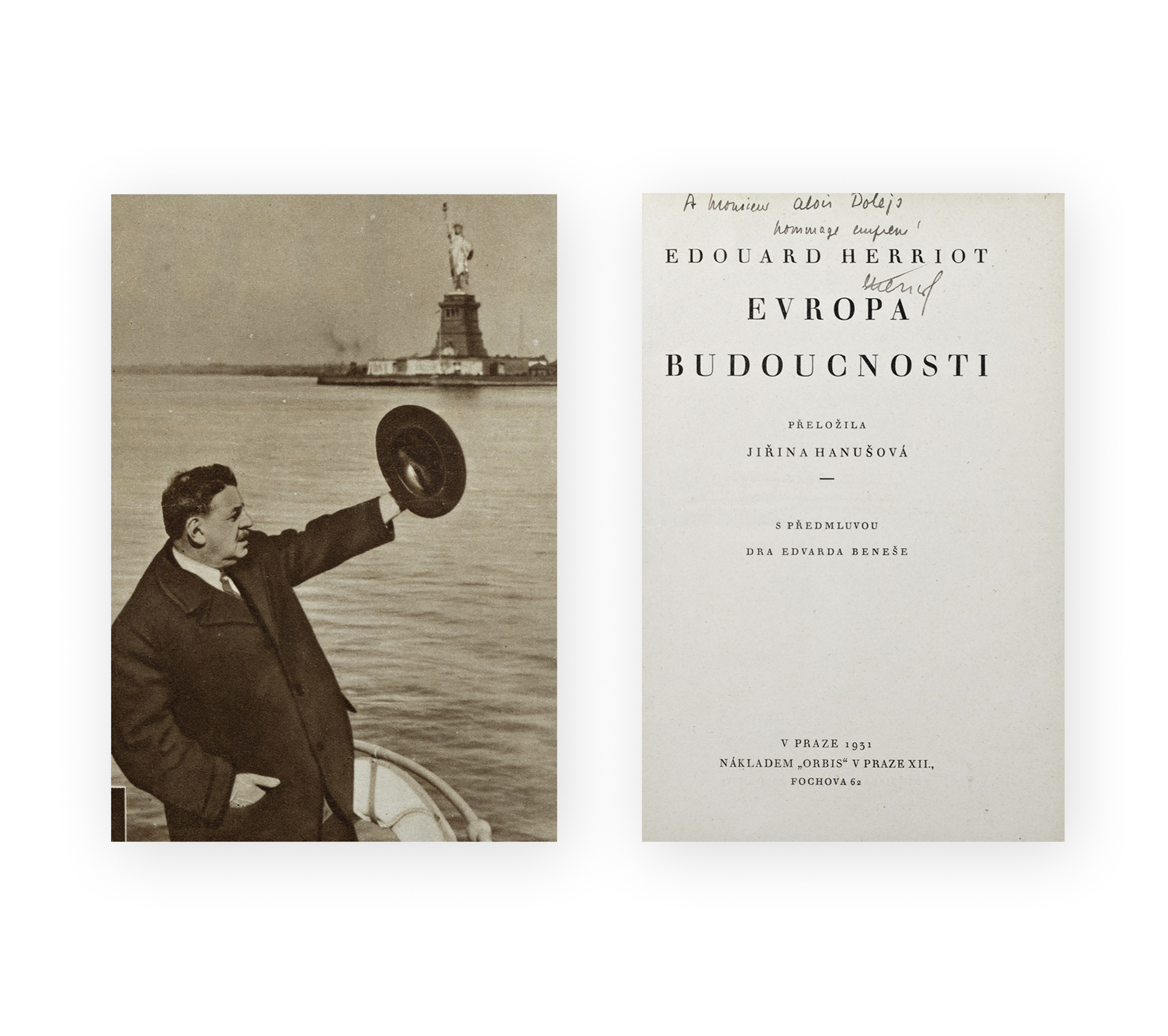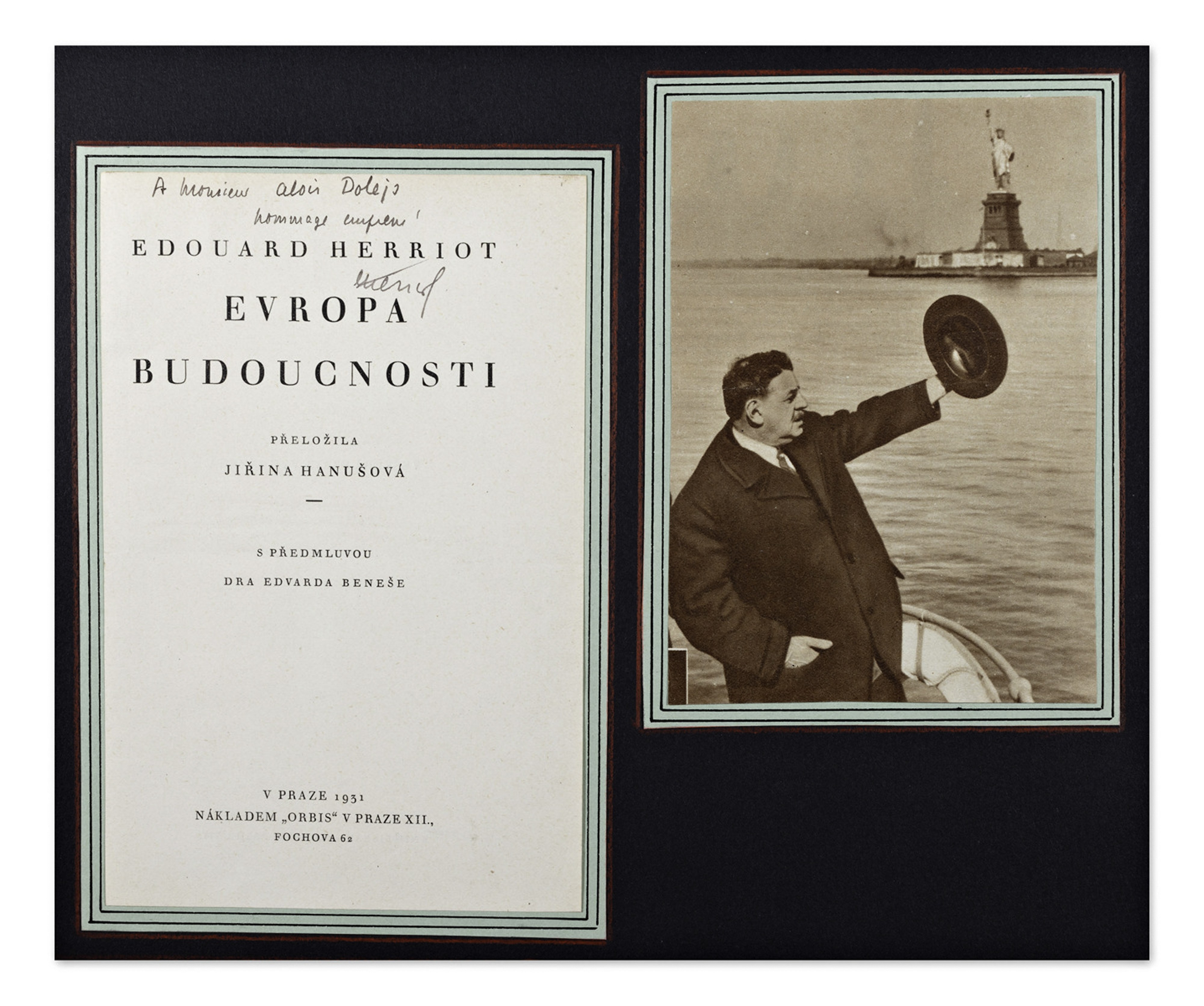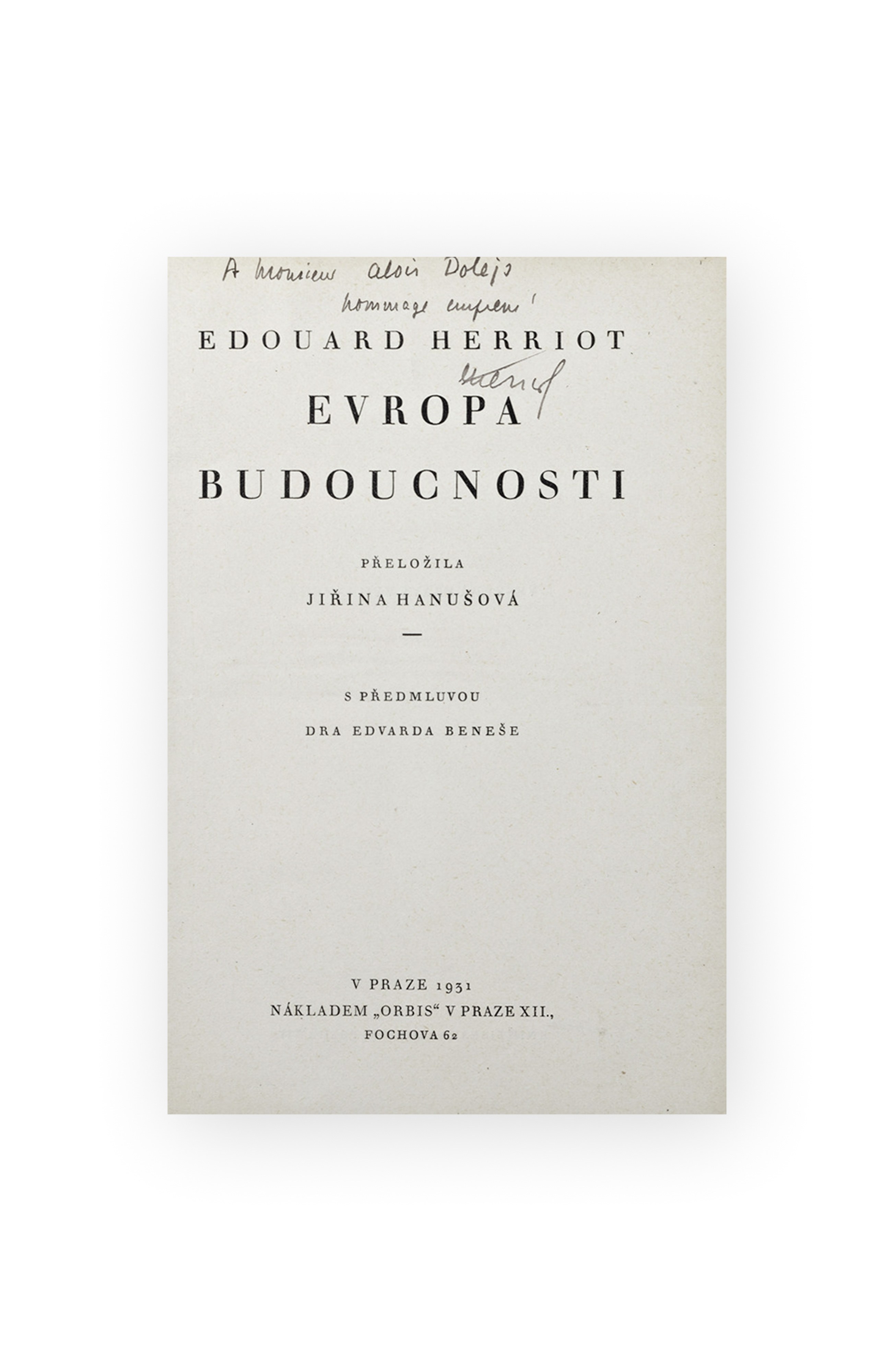 On the title page there is a handwritten dedication and signature of Édouard Herriot, addressed to Alois Dolejs: "A Monsieur Alois Dolejs, hommage empressé." Czech translation: "A warm tribute to Mr. Alois Dolejš." Édouard Herriot was a prominent French politician, writer and member of the Radical Socialist Party. He served as prime minister of France for several terms (1924-1925, 1926, 1932) and long-term mayor of Lyon (1905-1940, 1945-1957). He was also a member of the French Academy and a prominent advocate of European cooperation and democracy in the interwar period.Bidders are obliged to inform themselves about the condition of the lots before the auction, subsequent complaints will not be taken into account.