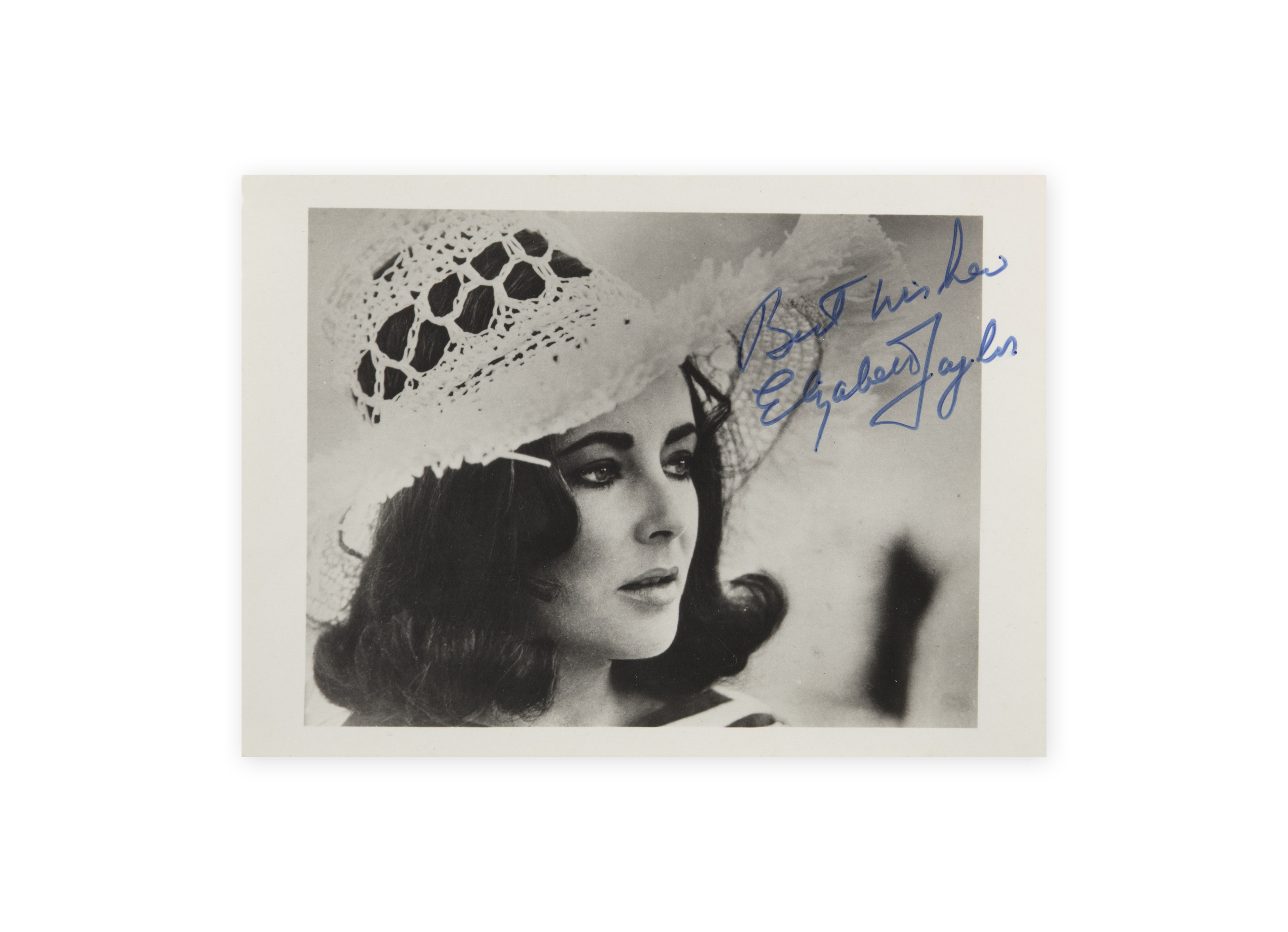 Autopen signature of Elizabeth Taylor on photo. Reproduction of the signature of a famous Hollywood actress using a mechanical device, suitable as a collector's item with visual and documentary significance.Bidders are obliged to inform themselves about the condition of the lots before the auction, subsequent complaints will not be taken into account.