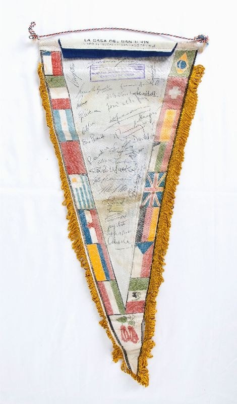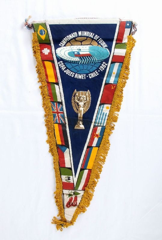 Original pennant for the Chile 1962 World Cup with autographs of the Italian footballers. Printed image of a football stadium, flags of the participating national teams, the Rimet cup and the words CAMPEONATO MUNDIAL DE FUTBOL - COPA JULES RIMET CHILE 1962. On the back of the pennant there are 30 autographs of the Italian national team players. The autographs are original, handwritten. We recognize Trapattoni, Buffon, Bulgarelli, Robotti, Rivera, Pascutti, Radice, David, Maschio, Sormani, Mattrel, Albertosi and others. Complete with rod. With LA CASA DEL BANDERIN mark - Santiago de Chile, with "Escuela de Aviacion Capitan Avalos" stamp. In excellent condition