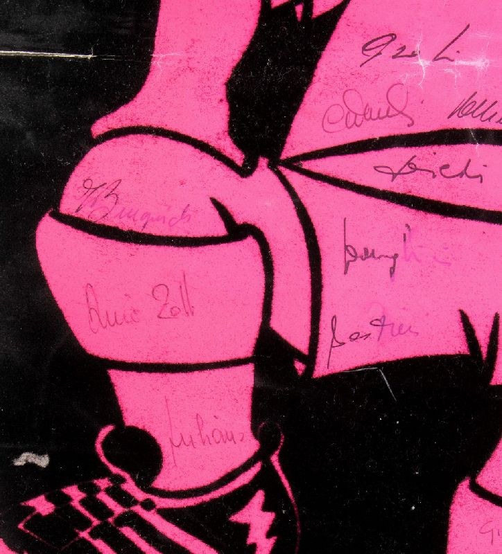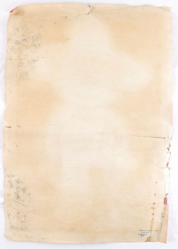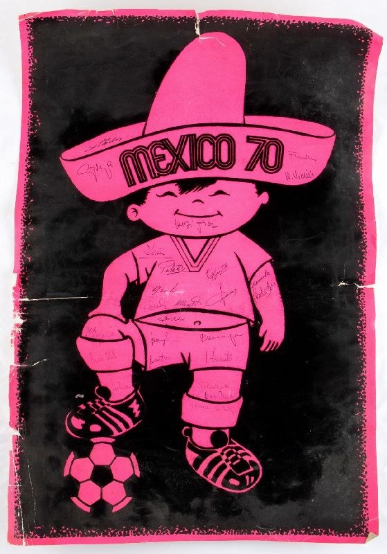 Poster of the MEXICO 70 Football World Cup, velvet paper, with the print of the mascot in sombrero, signed by the players of the Italian national team. Original signatures written by hand, in ink, include De Sisti, Juliano, Zoff, Burgnich, Boninsegna, Furino, Vicini. Branded LAPER.S.A. Mediocre conditions, various tears, traces of damp on the back