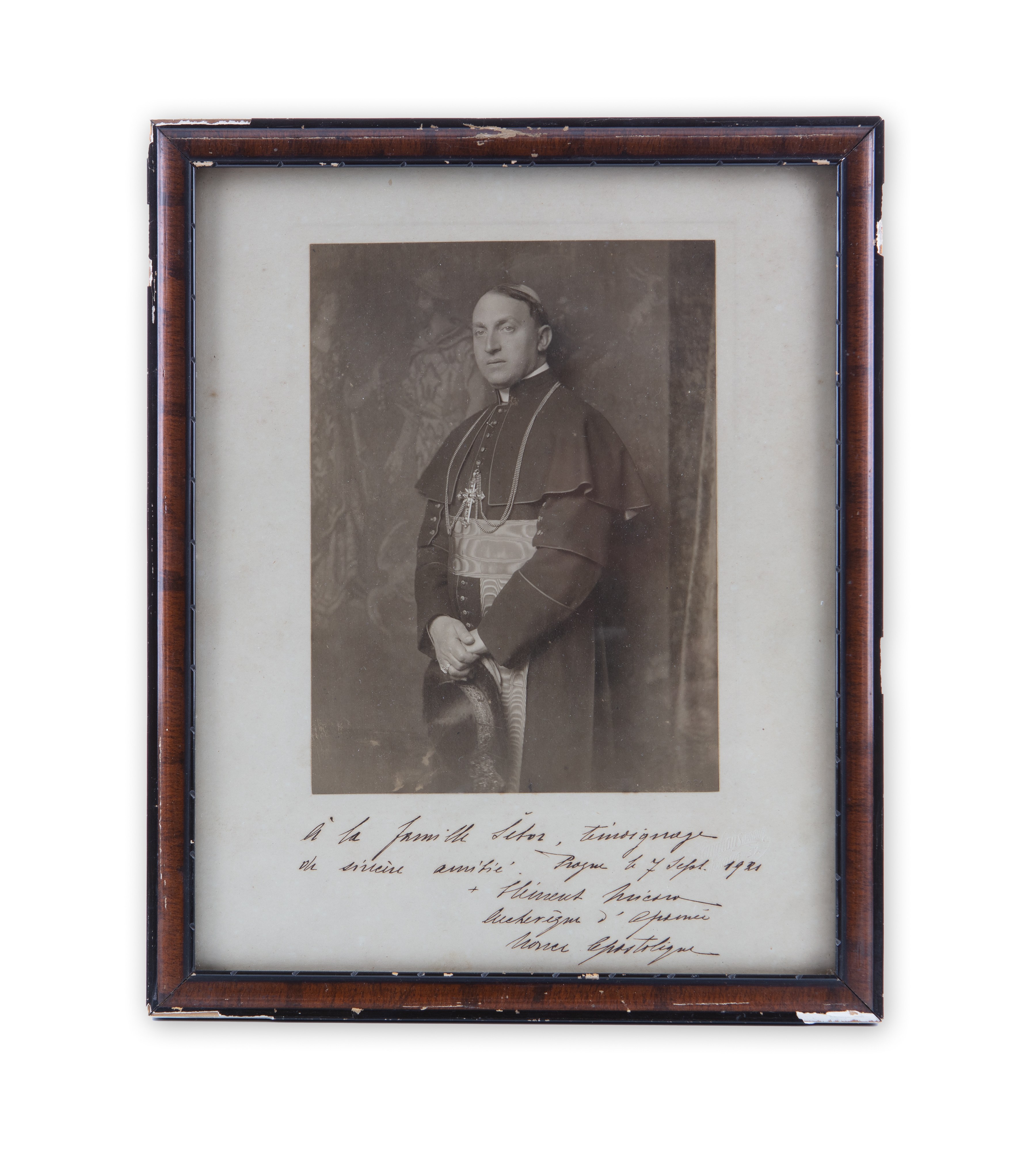 Personal photo with handwritten dedication and date with full name signature, full photo framed, dated January 11, 1928. Francesco Marmaggi was an Italian cardinal and diplomat of the Holy See, serving as apostolic nuncio in various countries, including Czechoslovakia. He was significantly involved in the diplomatic relations between the Vatican and the states of Europe in the 1920s.Bidders are obliged to inform themselves about the condition of the lots before the auction, subsequent complaints will not be taken into account.