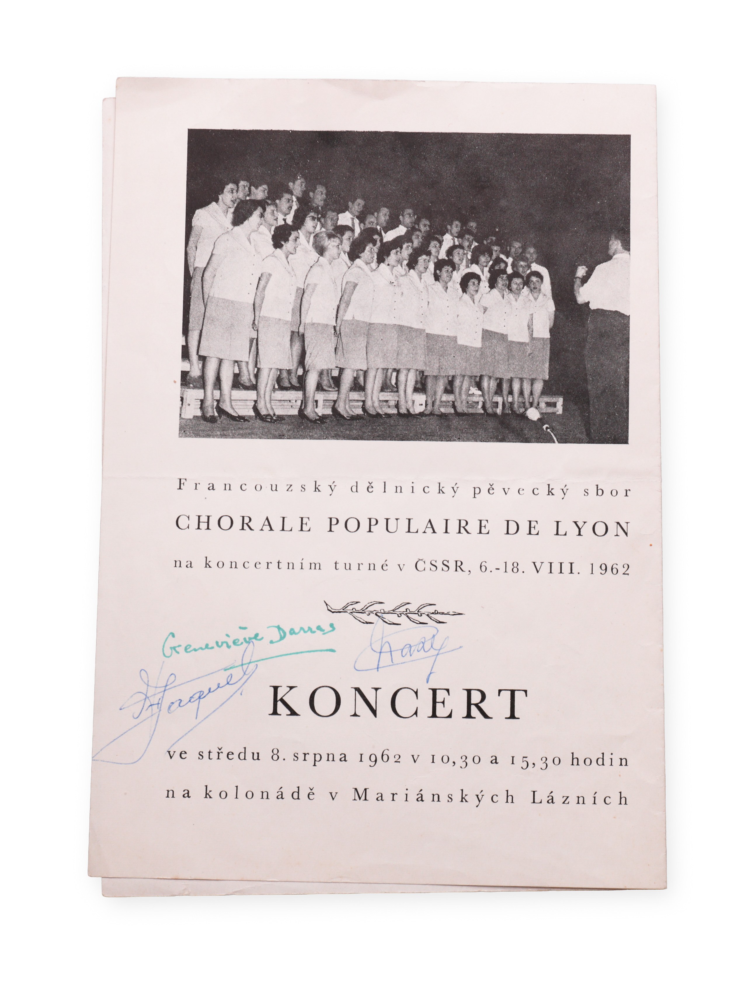 Signatures of the members of the French Workers' Choir on the program from a concert held on August 8, 1962. The document records the participation of this ensemble in a cultural event and is a valuable reminder of international musical cooperation in the 1960s.Bidders are obliged to inform themselves about the condition of the lots before the auction, subsequent complaints will not be taken into account.