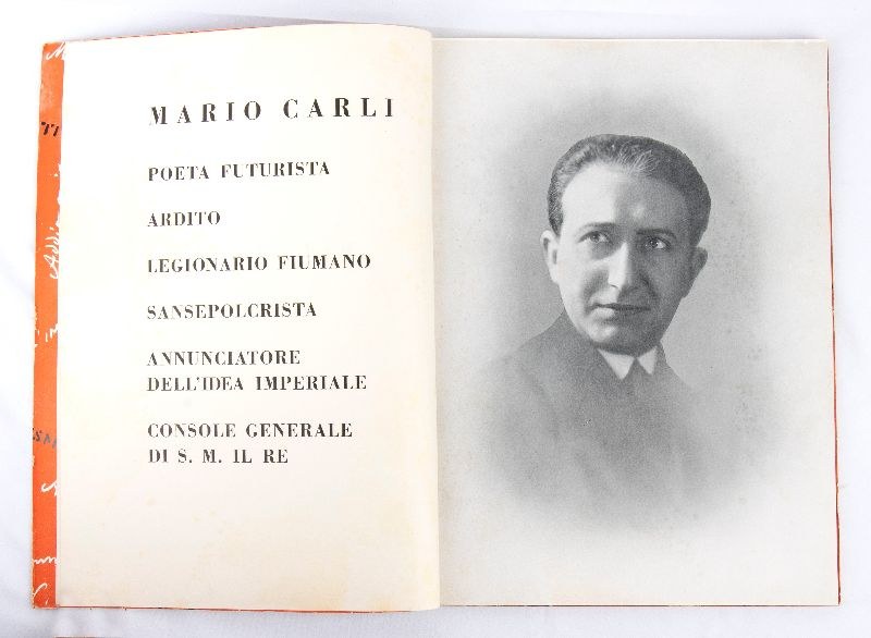 Volume published by Novissima in 1937, Filippo Tommaso Marinetti on "MARIO CARLI BOLD FUTURIST POET FIUMAN LEGIONARY SANSEPOLCRISTA ANNOUNCER OF THE IMPERIAL IDEA CONSUL GENERAL OF HM THE KING" Red editorial paperback binding, 80 unnumbered pages with 1 portrait of Carli. Measurements approximately 32 x 23 cm -Writings by Paolo Buzzi, Marinetti, Giuseppe Bottai, Bontempelli, Piero Bolzon, Giuseppe Brunati, G. A. Fanelli, Auro d'Alba, Settimelli, Francesco Sapori, Mario Dessy, Bruno Corra, Mino Somenzi, Alberto Simeoni. Excellent condition, tears on the lower spine and on the cover edges