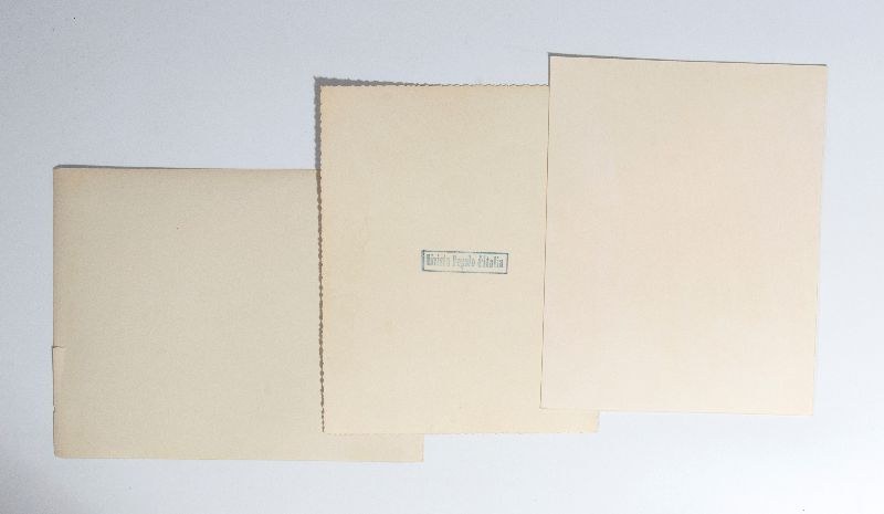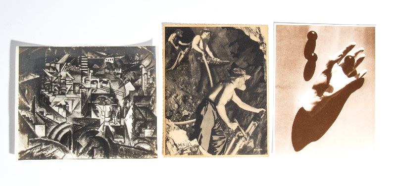 Lot of three mid-20th-century black and white photographs/photographic prints with a Futurist subject. One is likely a Soffici subject, one is signed R. MICAELLES (men working in a mine) on the bottom left, and another reproduces a famous composition by TATO. One bears the RIVISTA POPOLO D'ITALIA stamp on the back.Various sizes, approximately 16x21 cm, 17x21 cm, and 16x20 cm.