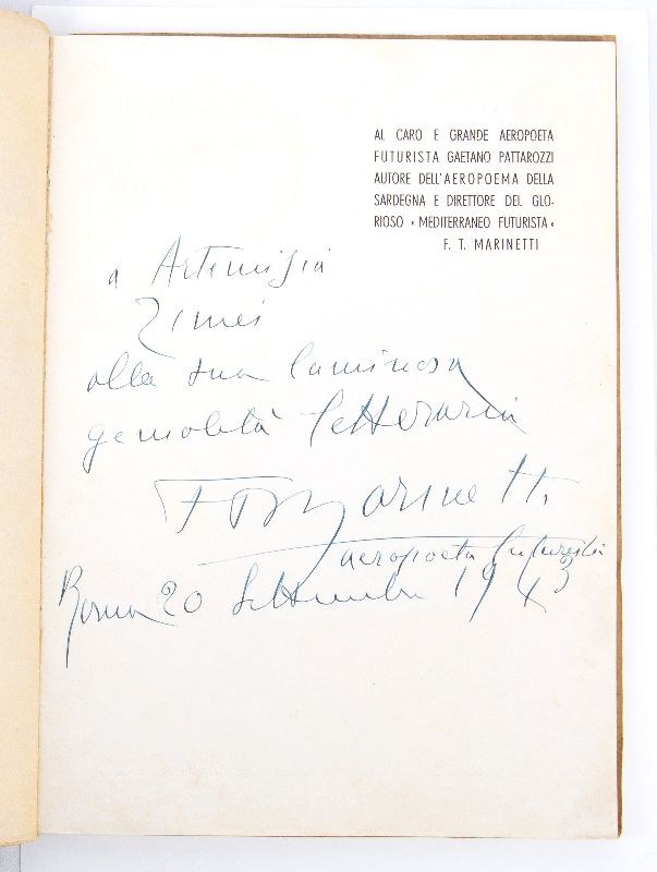 Marinetti, Filippo Tommaso (Alexandria of Egypt, 22 December 1876 – Bellagio, 2 December 1944) publication with the full title "We will take him back - shout the Duke of Aosta the soldiers of sky sea earth the black shirts of Uarieu pass and the infantrymen of Sviniuca sul Don" - On the front page, beautiful dedication and handwritten signature by Marinetti to the futurist poet Zimei. Volume illustrated with 146 drawings, plus the cover one (the Carabinieri of Culquabert) by Mario Menin (1896-1961), which recounts the war events of the Ethiopian war, in which both Marinetti and Menin participated as volunteers. Work created on the initiative of Gaetano Pattarozzi (1914-1959) - Bilingual edition, in Italian and German "Wir nehmen es uns wider" - Editions of the Futurist Mediterranean and of the CLET publishing house - Rome - Year XXI (1943) - Very good condition, wear on the cover edges. Measures approximately 22x30 cm, 160 pp
