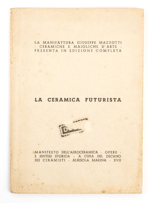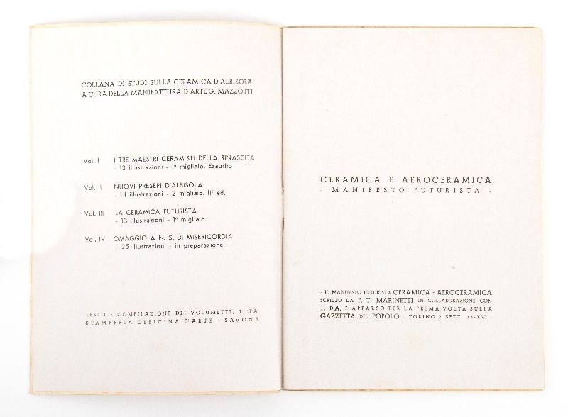 "Futurist ceramics. Aeroceramics manifesto - Works - And historical summary - By the dean of ceramists - Albisola Marina - XVII " - Photographic portrait of F.T. Marinetti and Giuseppe Mazzotti, 12 reproductions of black and white works in the text, texts by "T.d'A" Tullio d'Albisola. Reproduced works by the masters Mario Anselmo, Tullio D'Albisola, Nicolaj Diulgheroff, Farfa, Fillia, Lucio Fontana, Alfredo "Alf" Gaudenzi, Torido Mazzotti, Bruno Munari, Ricas, Nino Strada. Edizioni Ceramiche Futuriste, printed in 1939. Measurements 12.5 x 17.3 cm. Slight scattered foxing on the cover, excellent general condition