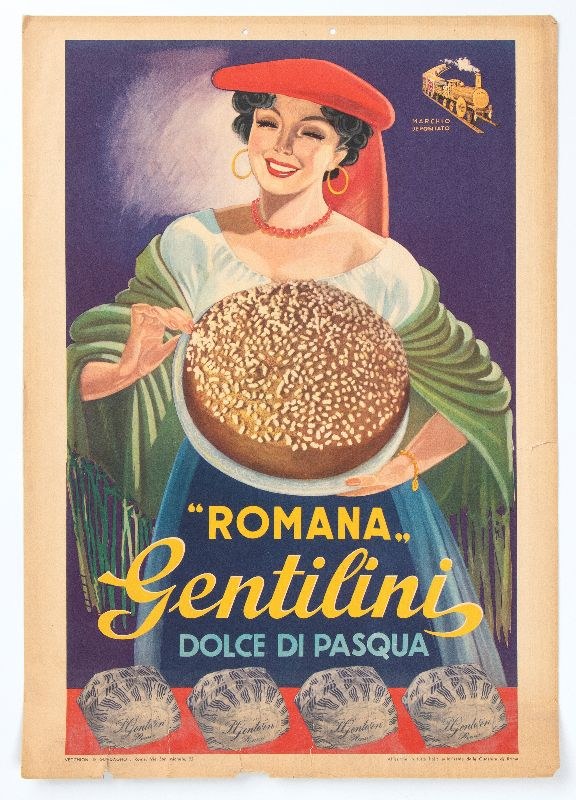 Poster, lithographic poster for "ROMANA" by GENTILINI - EASTER CAKEUnsigned.Vecchioni & Guadagno - RomeCondition B, tears on the bottom edge. Postmarks on the back, 1953 cancellation, size 50 x 35 cm not linen backing.