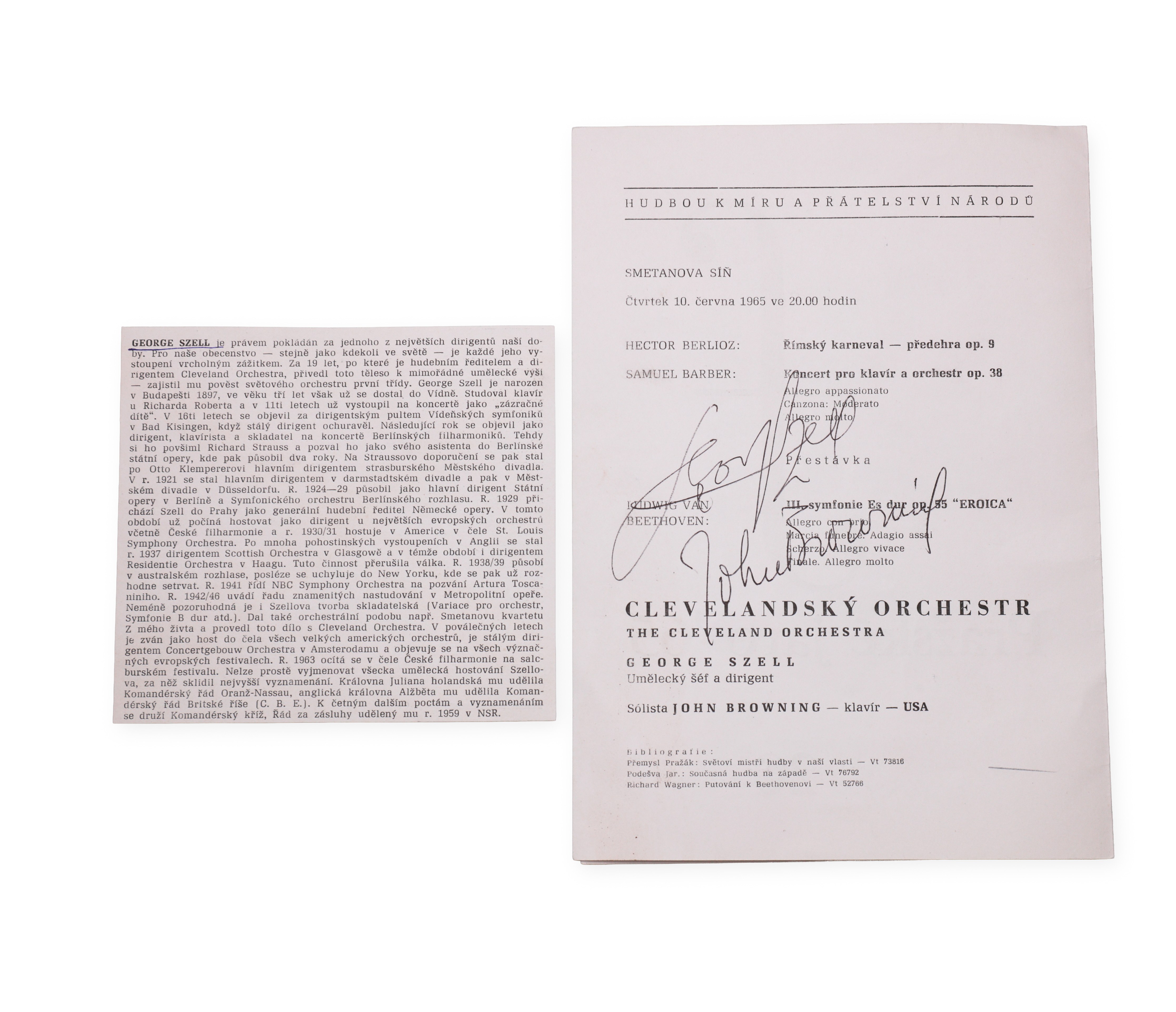 Program for the concert of the Prague Spring '65 festival, dated June 10, 1965, supplemented by an informative paper about the signed George Szell. George Szell was a world-renowned conductor and pianist, long-time principal conductor of the Cleveland Orchestra, known for his precision, discipline and depth of interpretation. This set is a commemoration of his performance at one of the most important international music festivals.