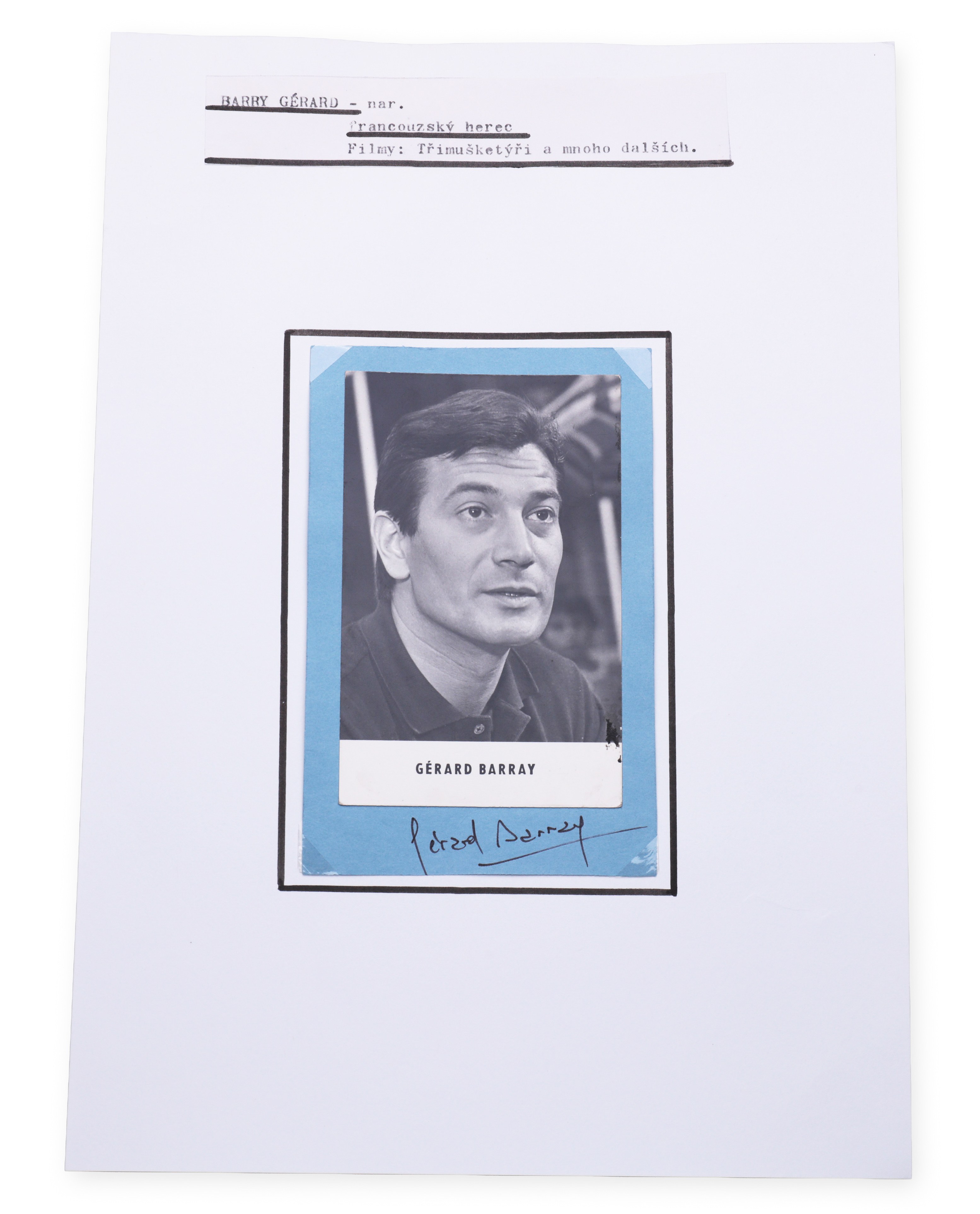 Gérard Barray's signature on a card with a pasted photo, placed on a collector's sheet. Gérard Barray was a French actor, known mainly from adventure and historical films of the 60s, such as "The Count of Monte Cristo", "Pardaillan" or "D'Artagnan". His signature represents an interesting collector's item associated with the era of classic cloak and swordsmanship films of French cinema.Bidders are obliged to inform themselves about the condition of the lots before the auction, subsequent complaints will not be taken into account.
