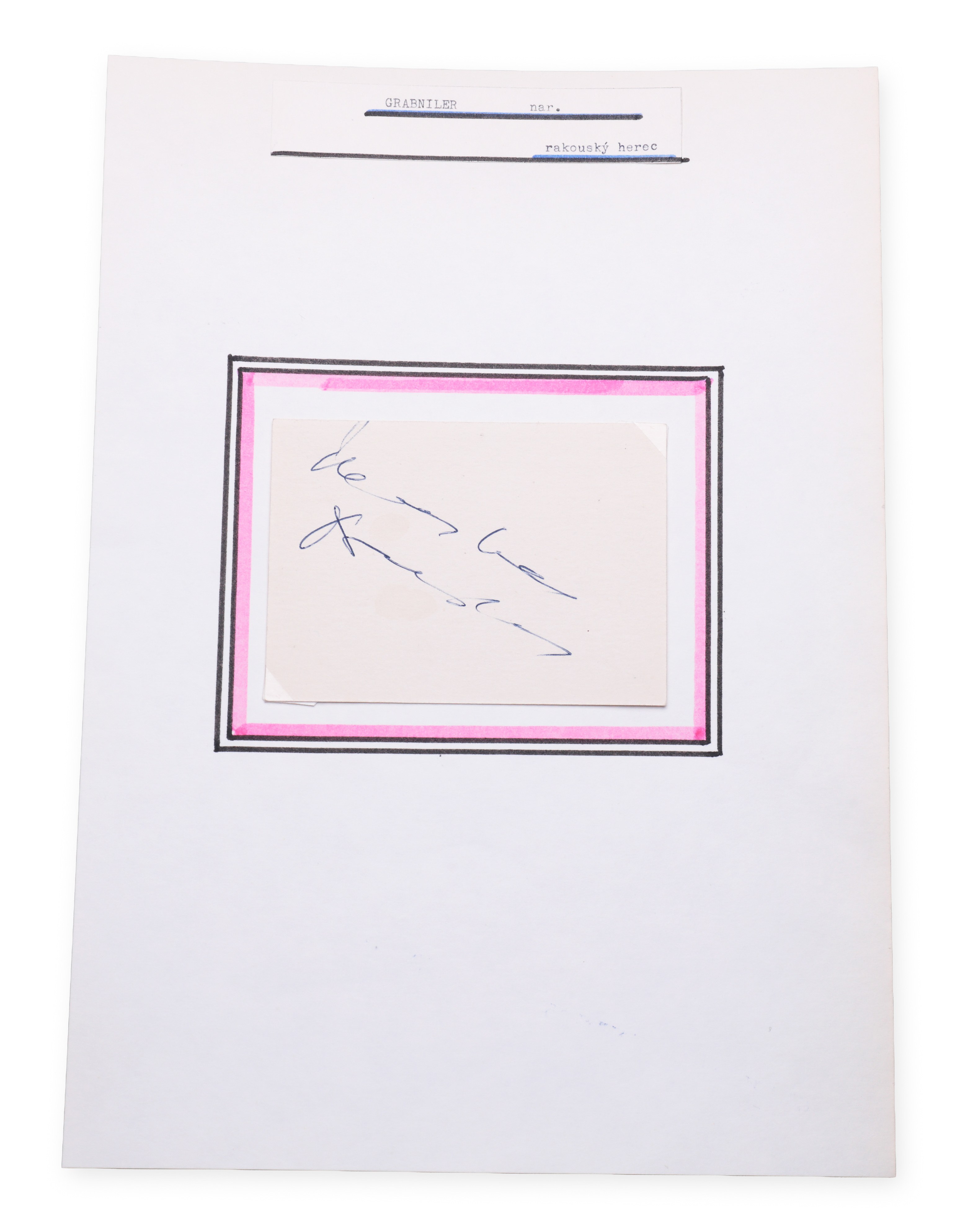 Signature of the actor Grabniler on a card placed on the collector's sheet. Although the exact identification of this actor is not documented, the signature can represent an interesting collector's item, especially in case of further research determination. In combination with a possible photo or period context, a lesser-known part of film or theater history can be valuable evidence of an actor's personality.Bidders are obliged to inform themselves about the condition of the lots before the auction, subsequent complaints will not be taken into account.