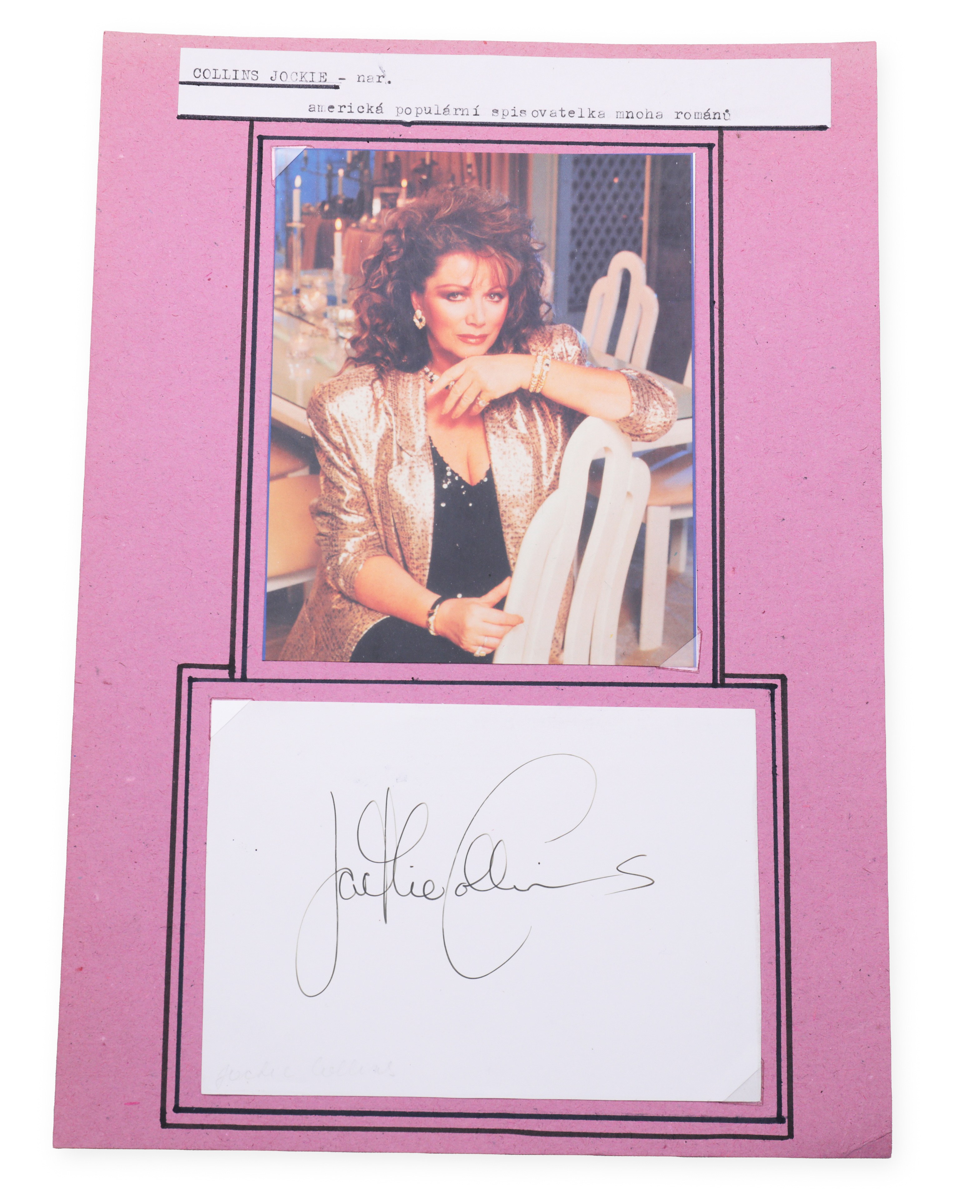 Attached to the collector's sheet is a card with the signature of the British author Jackie Collins, known for her bestselling novels set in the Hollywood cream of the crop, which have won readers all over the world.Bidders are obliged to inform themselves about the condition of the lots before the auction, subsequent complaints will not be taken into account.