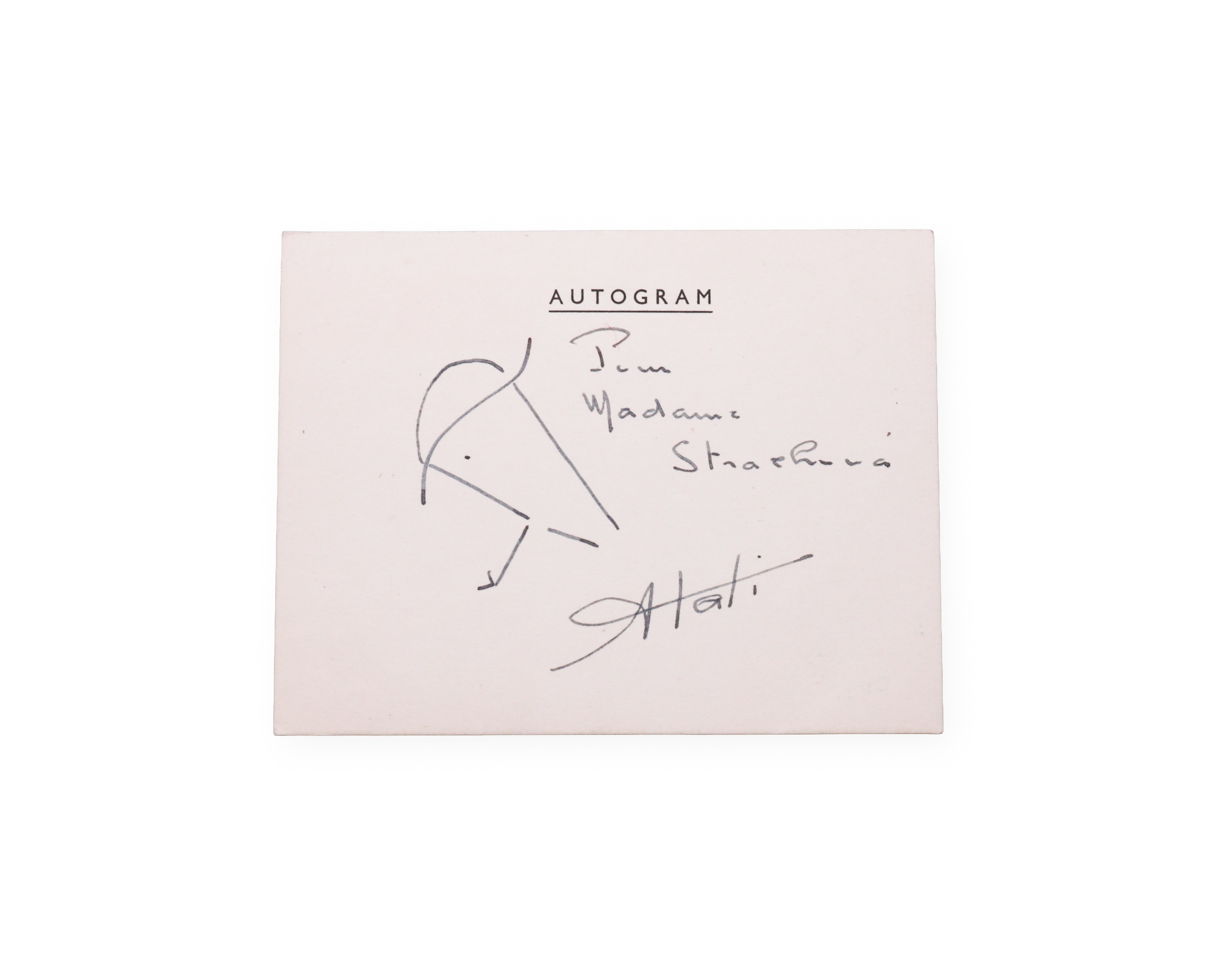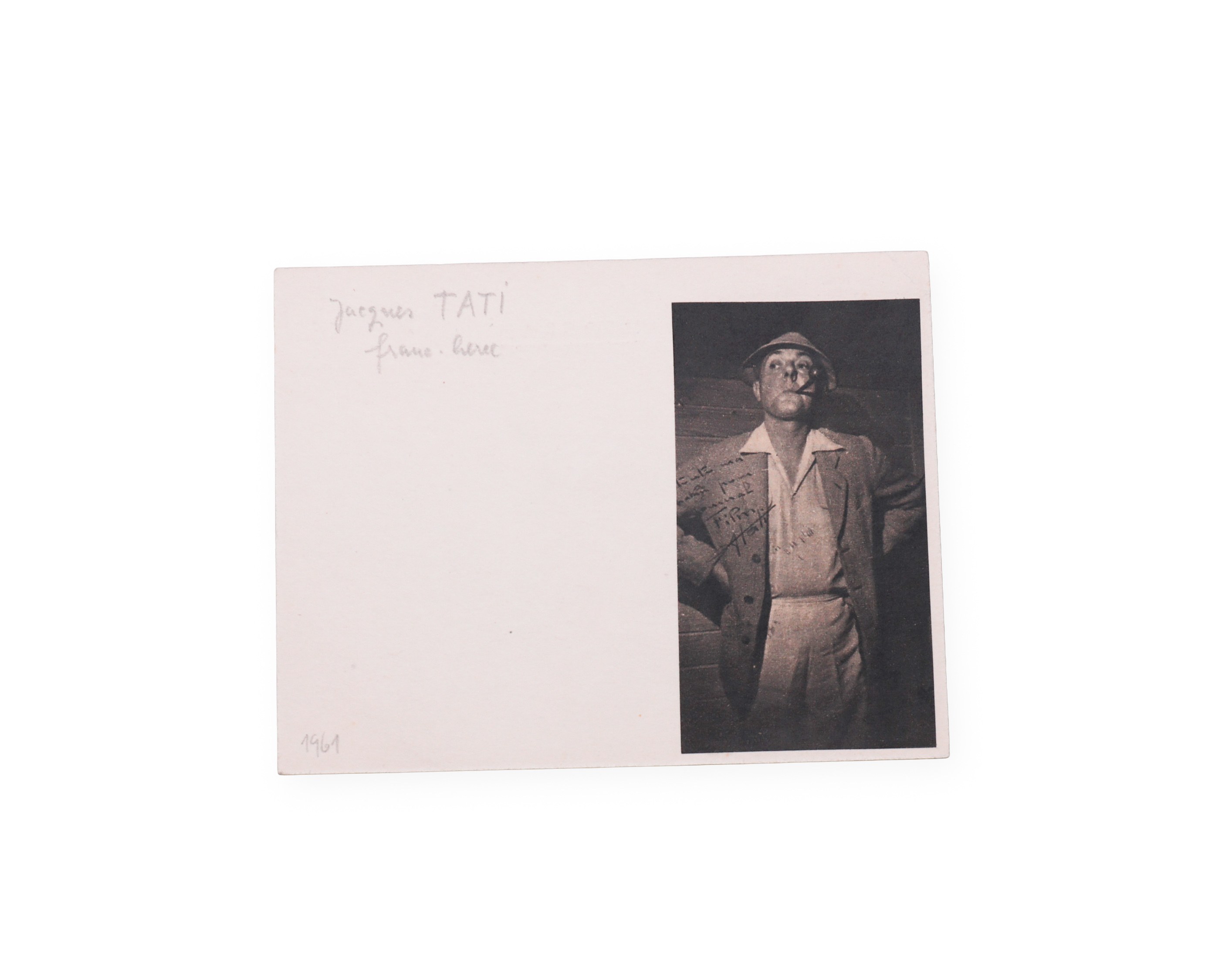 Jacques Tati was a French actor, director and screenwriter, famous for his comedy films and the character of Mr. Hulot. Signature with drawing and dedication on a card from 1961, on the reverse of which is pasted a newspaper photograph, a valuable document associated with his film career.Bidders are obliged to inform themselves about the condition of the lots before the auction, subsequent complaints will not be taken into account.
