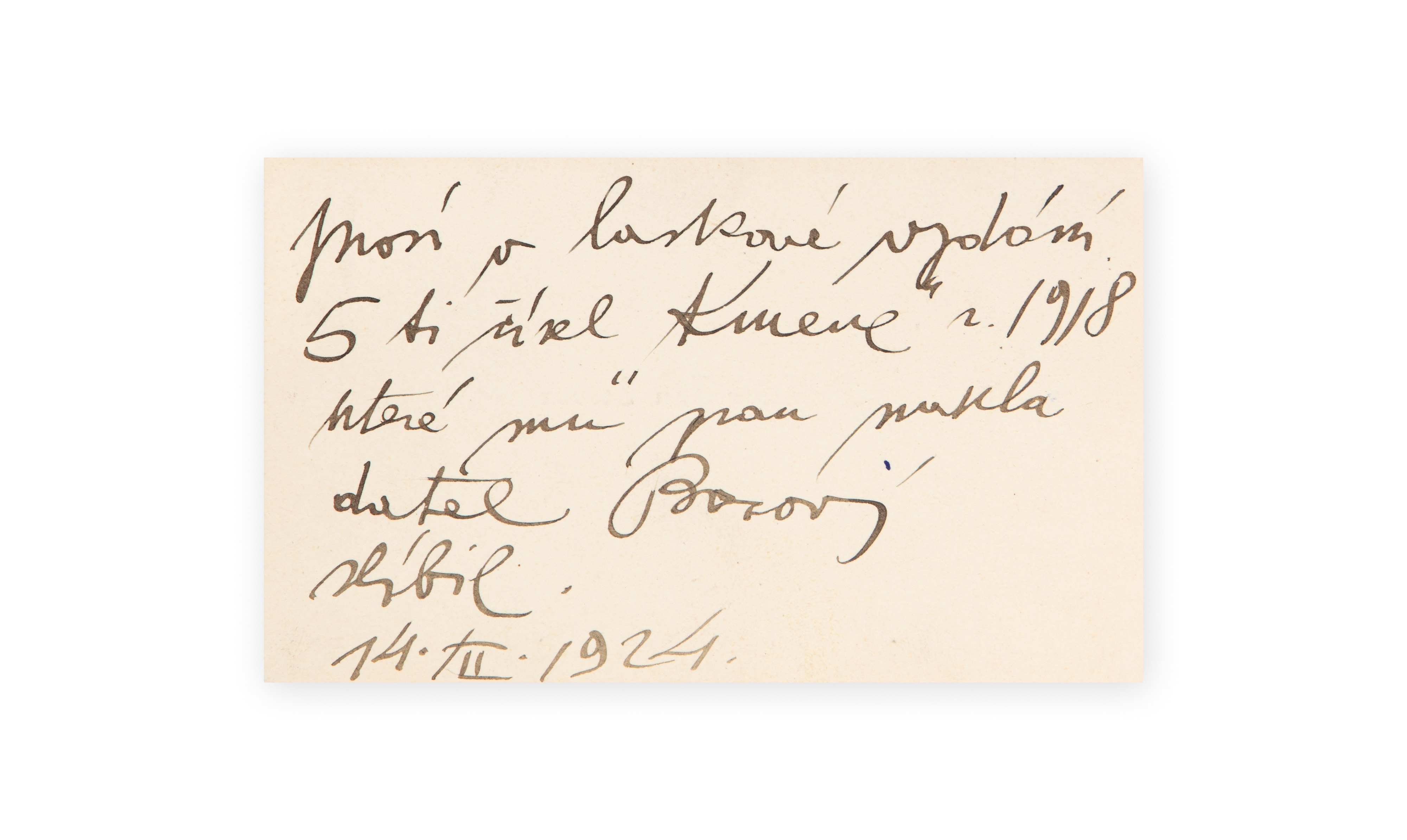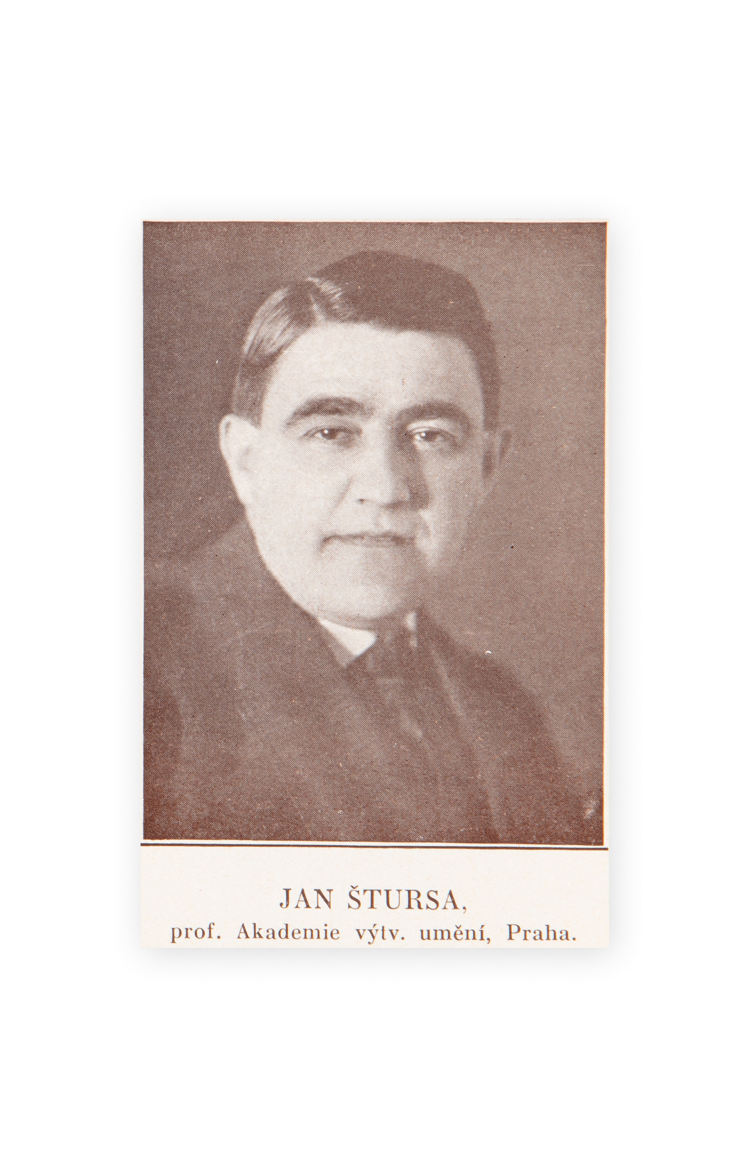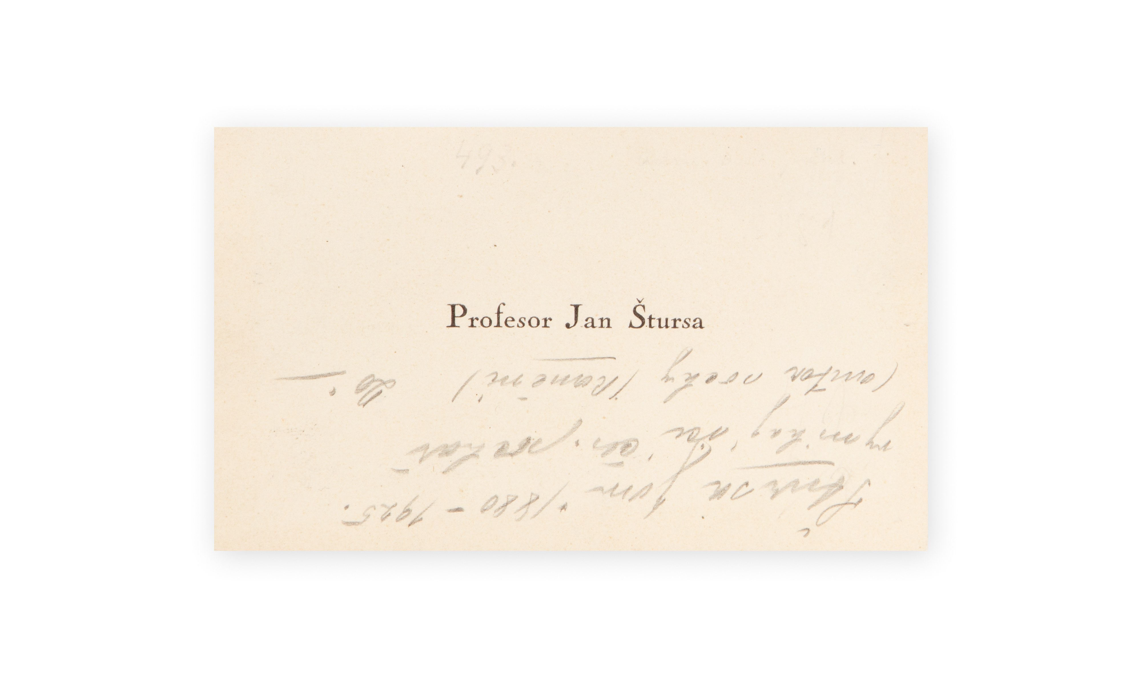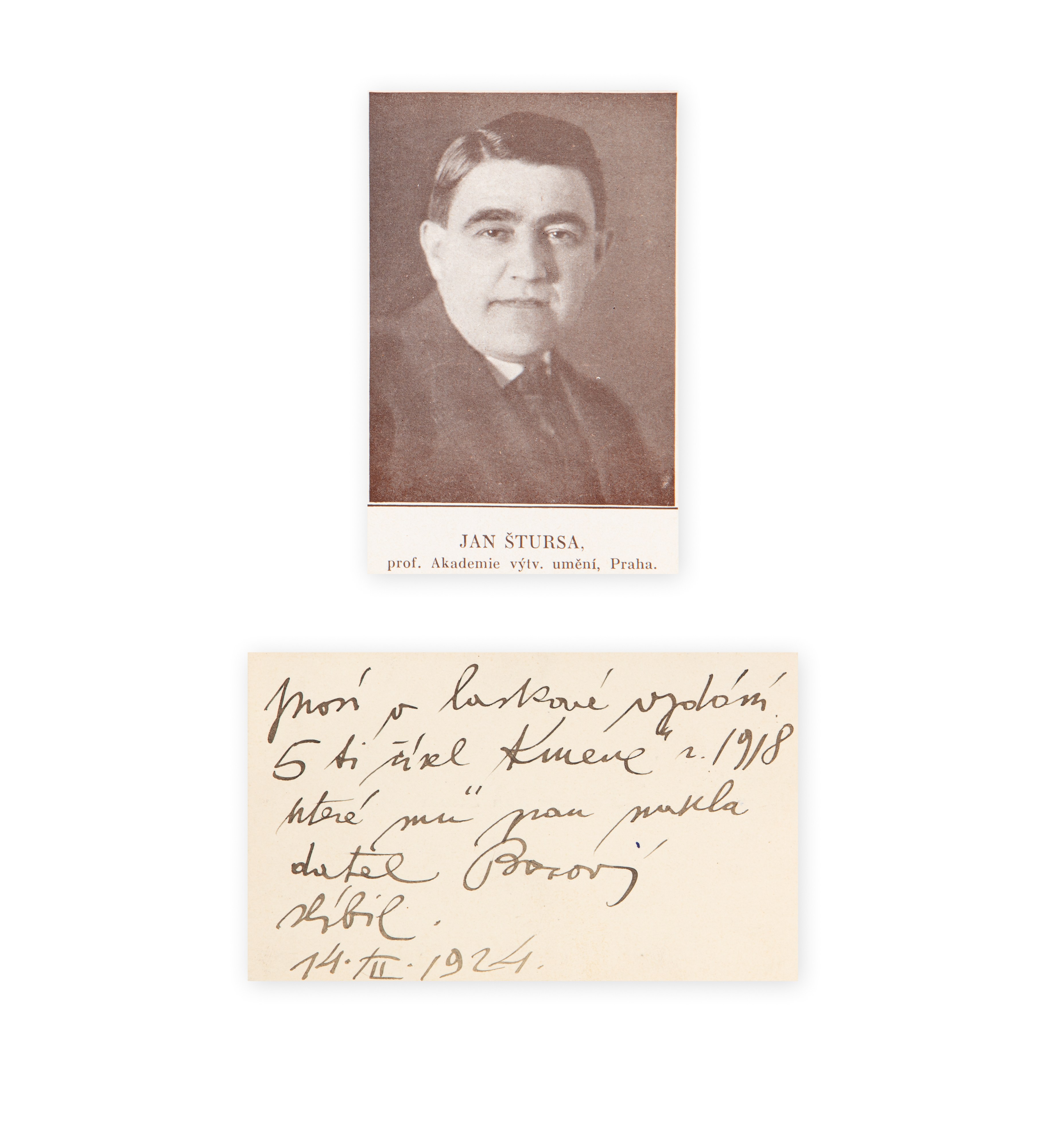 Manuscript of Jan Josef Štursa on his personal business card dated February 14, 1924, accompanied by a portrait photograph with the printed name and title *"prof. Academy of Fine Arts, Prague"*. One of the most important Czech sculptors of the first third of the 20th century, Štursa was a representative of modern sculpture, whose work combined symbolism with emotional depth and formal purity. As a professor at the Prague Academy, he influenced a whole generation of young sculptors. This collection documents not only his artistic status, but also the personal culture and public recognition he enjoyed at the end of his life.Bidders are obliged to inform themselves about the condition of the lots before the auction, subsequent complaints will not be taken into account.
