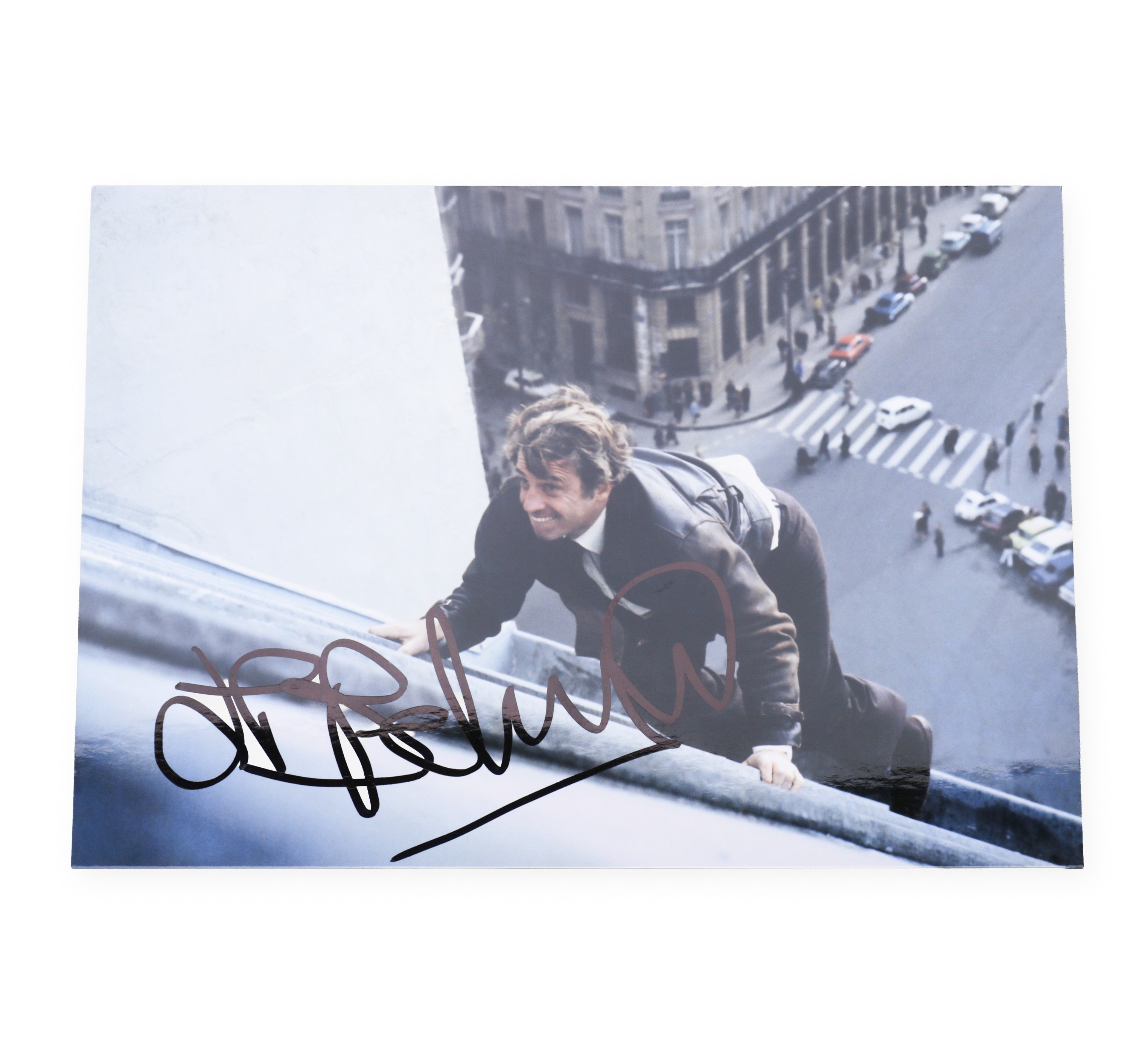 Jean-Paul Belmond's secretarial signature on a photo of the actor climbing on the roof. A typical motif for his action film roles, which often involved stunts without stuntmen. Jean-Paul Belmondo was a symbol of the French action film and belonged to the most prominent figures of European cinema. Despite the secretarial origin of the signature, it is an attractive collector's item reminiscent of his unmistakable style.Bidders are obliged to inform themselves about the condition of the lots before the auction, subsequent complaints will not be taken into account.