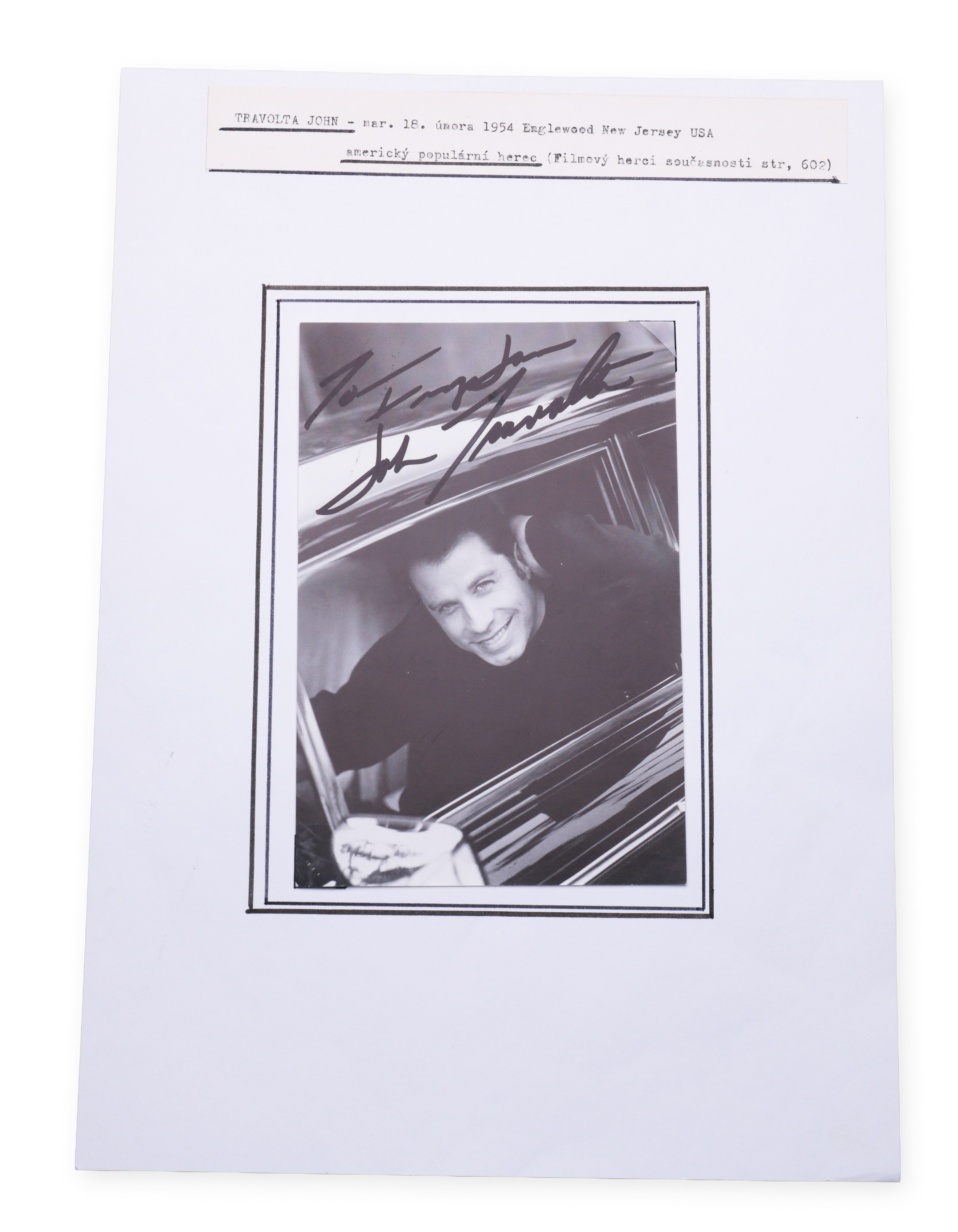 John Travolta's signature on a photograph placed on a collector's sheet. John Travolta is an American actor, singer and dancer who became famous thanks to iconic roles in films such as "Saturday Night Fever", "Pomade" or "Pulp Fiction". His signature represents an attractive collector's item associated with one of the most prominent personalities of modern Hollywood.Bidders are obliged to inform themselves about the condition of the lots before the auction, subsequent complaints will not be taken into account.