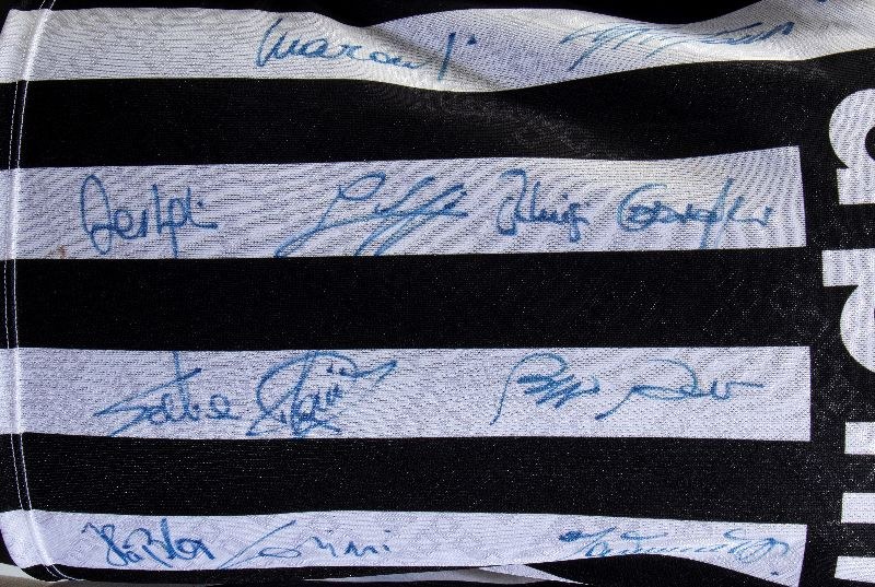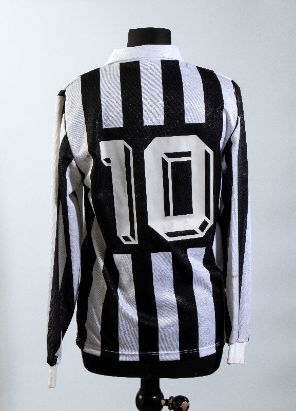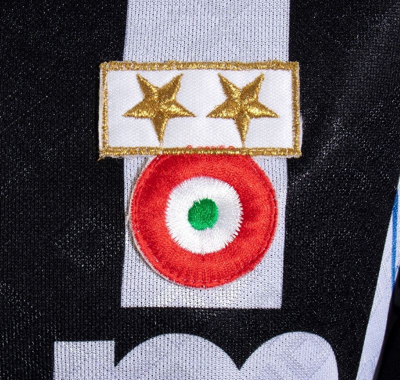 Jersey shirt, UPIM, long sleeves. Kappa label on the inside collar, made in Italy, size L. Light scattered stains/halos not defacing, shirt in excellent conditionCounting 16 autographs of Juventus players, original in blue marker, recognizable Julio Ceasar, Roberto Baggio, Totò Schillaci, Thomas Hassler, Eugenio Corini, Daniele Fortunato, Nicolò Napoli, Giancarlo Marocchi, Stefano Tacconi, Luigi De Agostini, Gianluca Luppi, Pierluigi Casiraghi. Galia. In perfect condition, slight stains on the right sleeve.On the front: UPIM sponsor, Kappa logo embroidered in green, tricolor cockade and band with two sewn stars.On the back: number 10 in sublimationProvenance: private collection, sports journalistAt the buyer's request, the certificate of authenticity can be provided for a fee