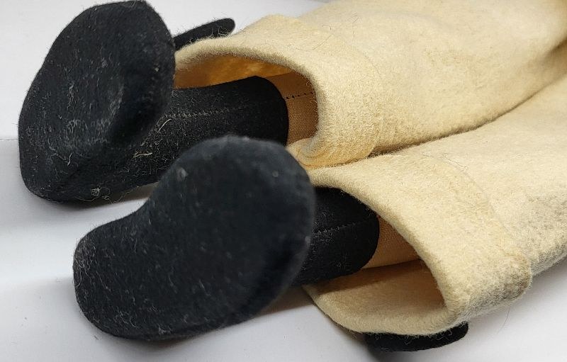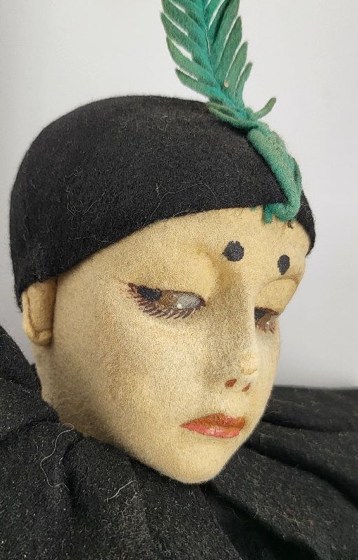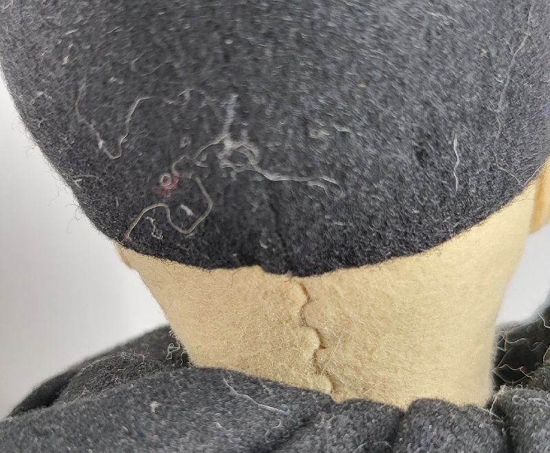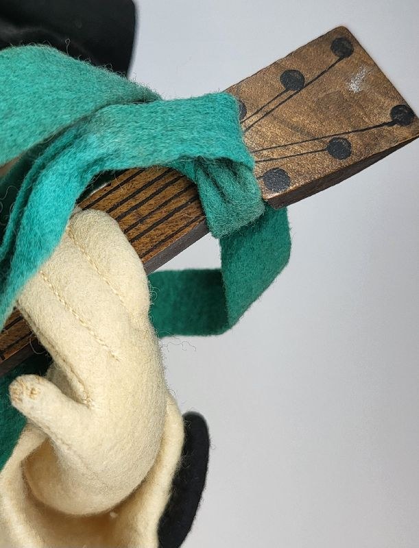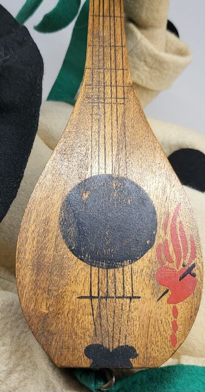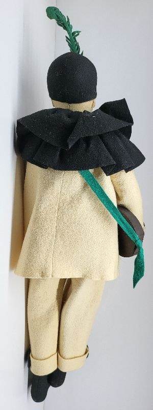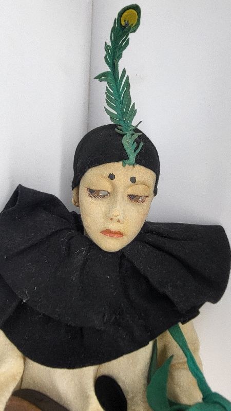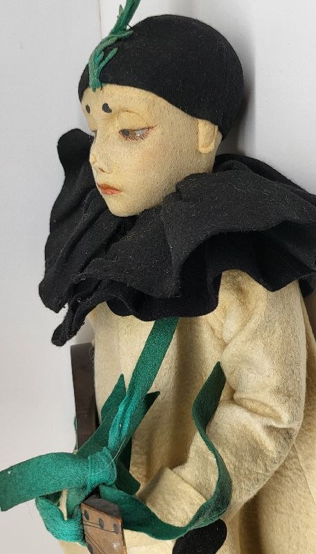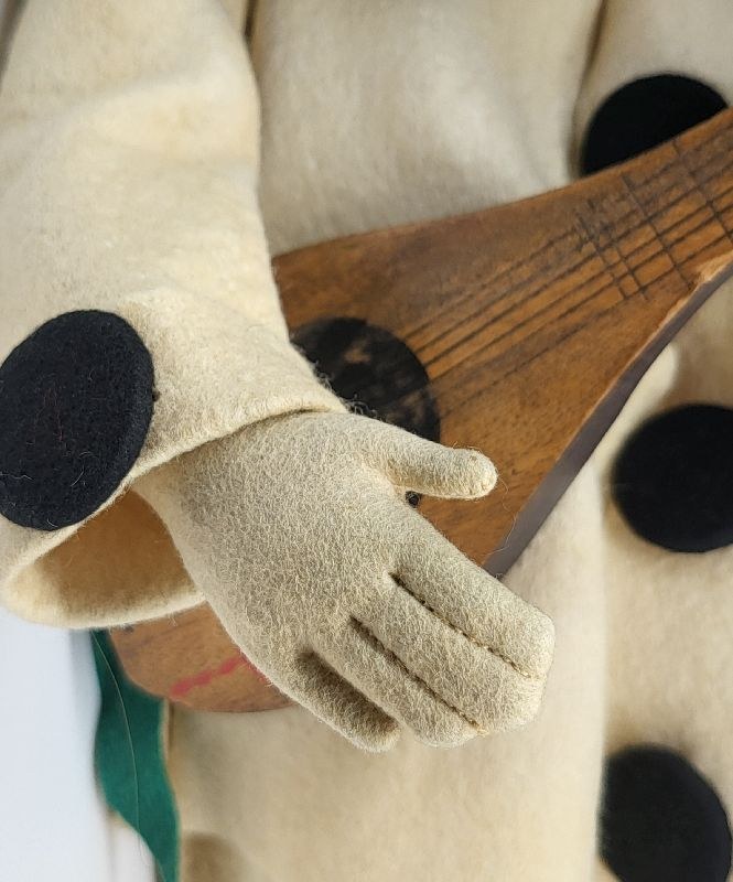 Pierrot by LENCI, original from the early 1900s. Complete with his hand-painted wooden guitar. Characteristic hand-painted sad face, white felt dress with large black buttons, and a pleated black cloth collar. Black bonnet and green feather. The classic zigzag stitching typical of the original LENCI factory in Turin is visible at the nape of the neck.Hinged legs with bendable knees.In excellent condition. Measures approximately 54 cm in height.