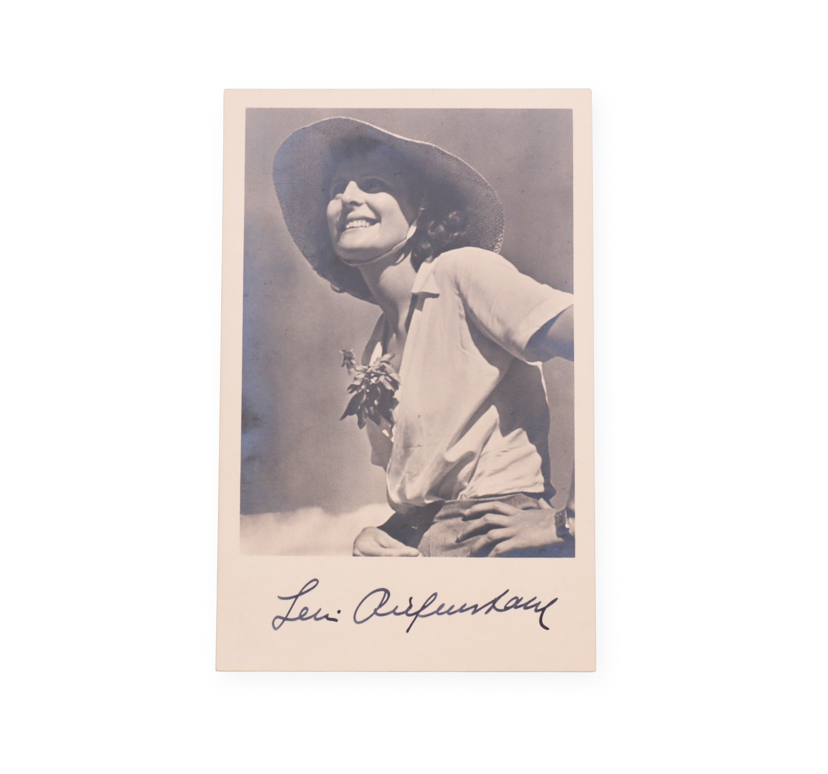 Signature of the German director, actress and photographer Leni Riefenstahl with her full name on a postcard with her photo. A prominent and controversial personality of the 20th century, she became famous especially as the author of the visually pioneering but ideologically controversial films "Triumph of the Will" and "Olympia", which became icons of film aesthetics and propaganda. After the war, she devoted herself to photography and travel writing, especially among African tribes. Her signature represents a historically significant artifact, commemorating a person who influenced the history of film, but remains the subject of ethical and political debate.Bidders are obliged to inform themselves about the condition of the lots before the auction, subsequent complaints will not be taken into account.