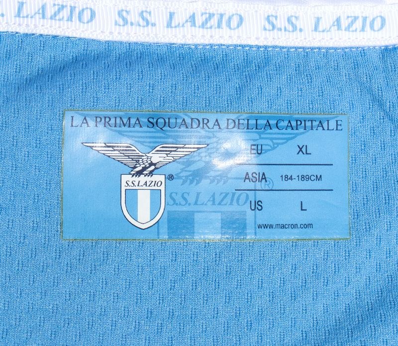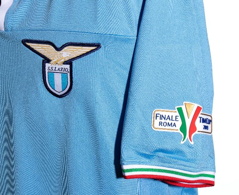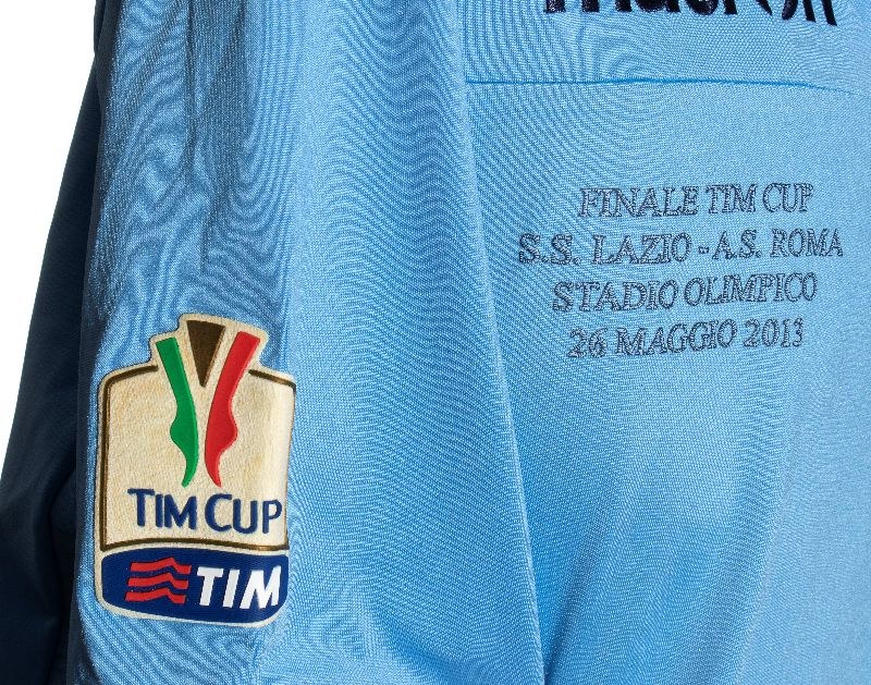 SS LAZIO short-sleeved home jersey, MACRON polo jersey, 2013 TIM CUP final. White collar and cuffs with Italian flag, internal labels "LA FINALE DELLA CAPITALE" (THE FIRST TEAM OF THE CAPITAL), size XL.Made-to-order jersey for Lulic, 2013 TIM CUP (Coppa Italia) final, SS LAZIO - AS ROMA, in perfect condition.On the front: embroidered Macron logo, "FINALE TIM CUP / SS LAZIO - AS ROMA / STADIO OLIMPICO / 26 MAGGIO 2013"embroidered, SS LAZIO logo applied.On the sleeves: Macron logo on the shoulders, TIM CUP patch applied on the right sleeve, and FINALE ROMA TIM CUP 2013 patch applied on the left.On the back: embroidered SS LAZIO logo, number 19, LULIC name in sublimation.In perfect condition.Provenance: Sports journalist, private collection.