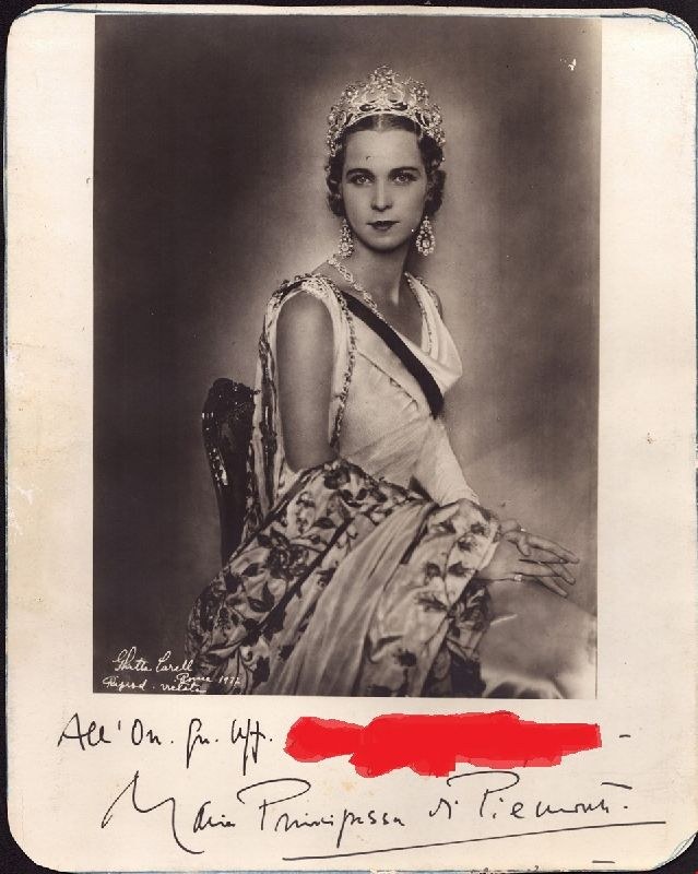 Black and white photograph of Maria José - Princess of Piedmont (Marie José of Belgium - Marie José Charlotte Sophie Amélie Henriette Gabrielle - Ostend, August 4, 1906 – Thônex, January 27, 2001) with dedication and autograph in black ink.Photo printed on cardboard, measures approximately 23 x 29 cm, signed by Ghitta Carell - Rome 1937. In good condition (rounded corners from scissors cutting, name only digitally hidden for privacy)(The photograph can be accompanied by a COA upon request, for a fee.)
