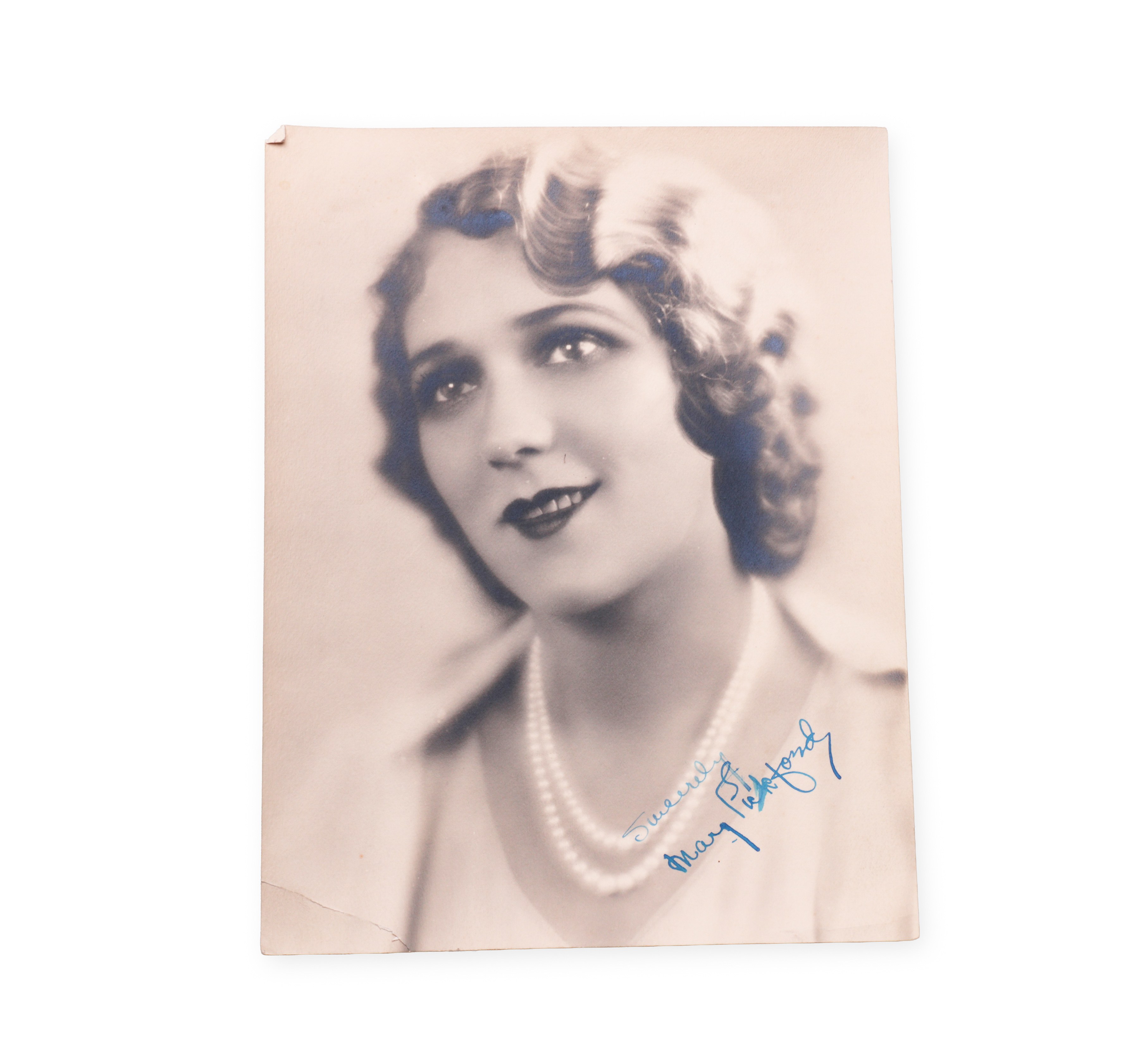 Photo of actress Mary Pickford autographed and dedicated "Sincerely." Mary Pickford (1892 – 1979) was a pioneer of American cinema, a star of the silent era and a co-founder of United Artists. The document has a high collector's and film-historical value.Bidders are obliged to inform themselves about the condition of the lots before the auction, subsequent complaints will not be taken into account.