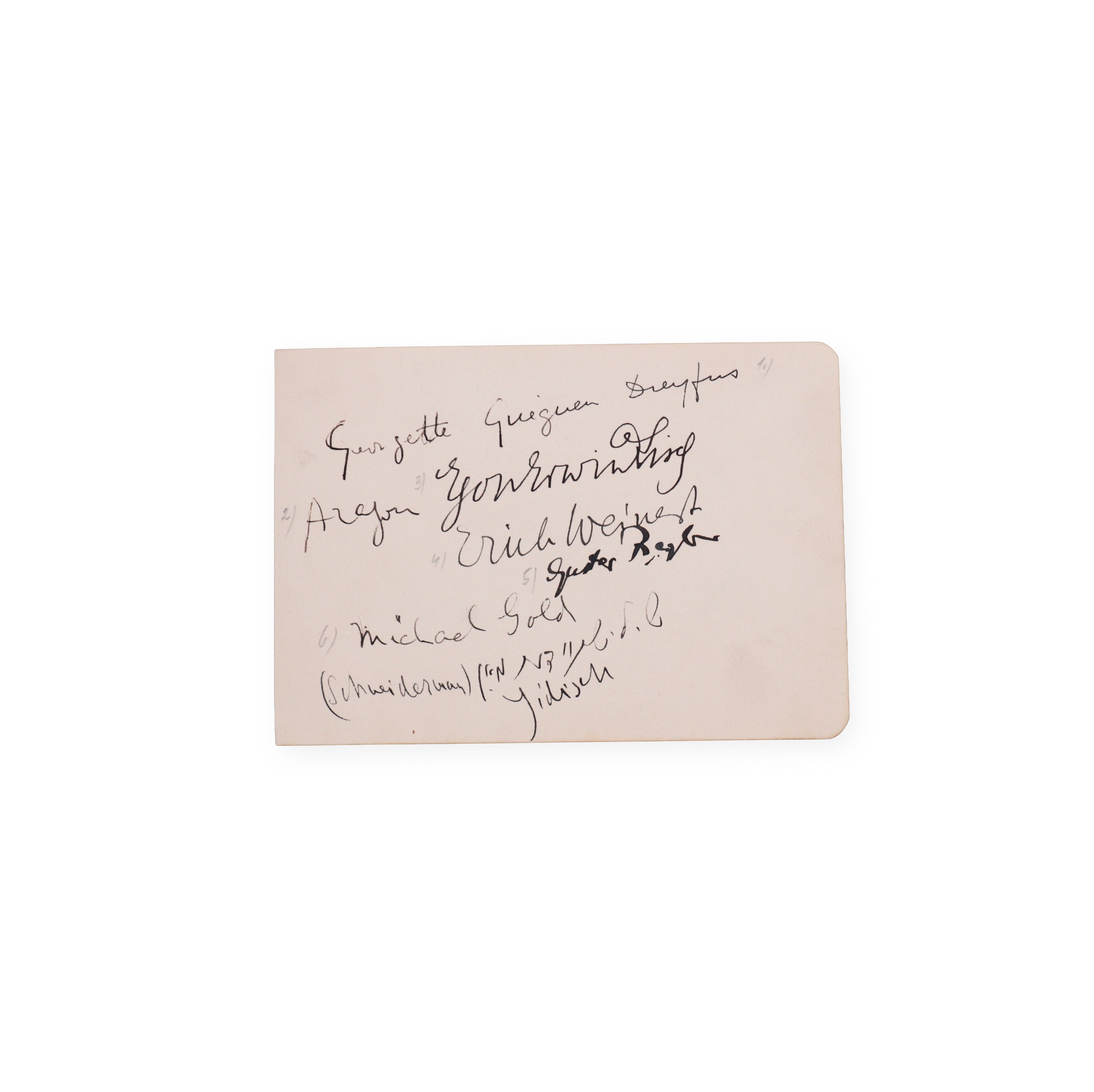 Michael “Mike” Gold, Louis Aragon and Egon Erwin Kisch – writers, journalists, journalists and literary critics. The signatures of these three personalities together with three other journalists on one scrap of paper, an authentic document associated with their journalistic and literary activities.Bidders are obliged to inform themselves about the condition of the lots before the auction, subsequent complaints will not be taken into account.