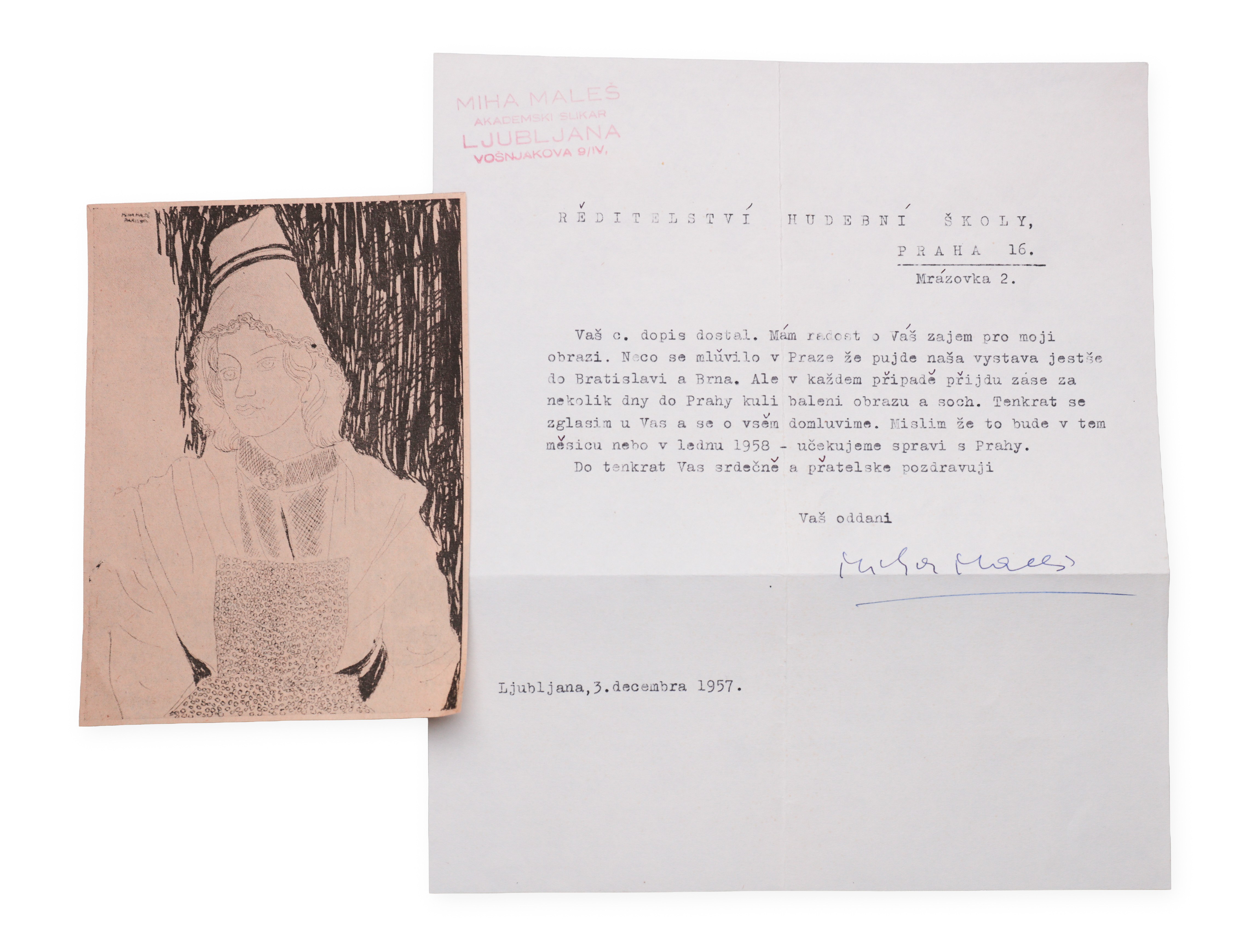 Letter from Miha Maleš, dated December 3, 1957, addressed to the directorate of the music school and concerning his exhibitions, accompanied by a newspaper clipping with a photograph of one of his drawings. Miha Maleš was a Slovenian painter, graphic artist and illustrator, one of the key representatives of modern visual arts in Slovenia. The documentary captures his activity in the area of presenting his own work and connecting creative activity with cultural institutions.Bidders are obliged to inform themselves about the condition of the lots before the auction, subsequent complaints will not be taken into account.