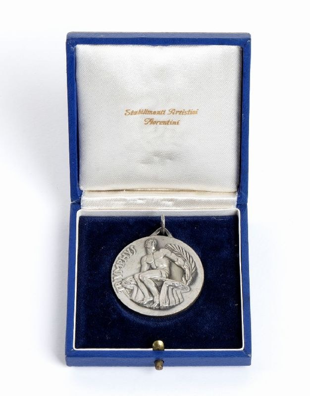 Medal for the torchbearers of the Olympic Torch route for the 1948 London Olympics. ITALIAN NATIONAL OLYMPIC COMMITTEE - OLYMPIC TOrch - OLIMPIA LONDON 15-29 JULY 1948. Signed Manetti, in original Stabilimenti Artistici Fiorentini box. Medal with slight damage to the edge, excellent overall condition