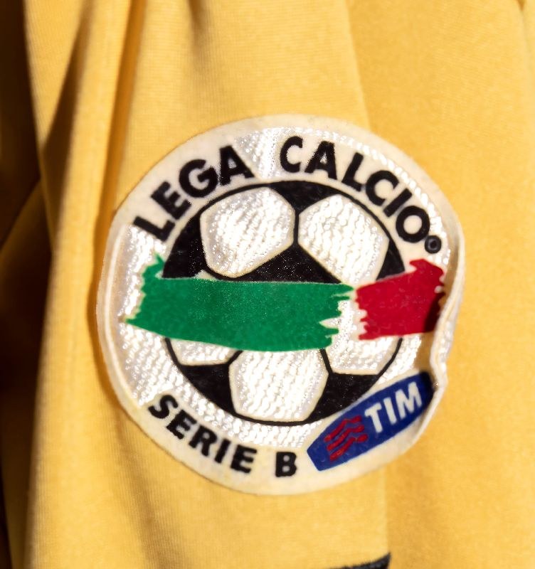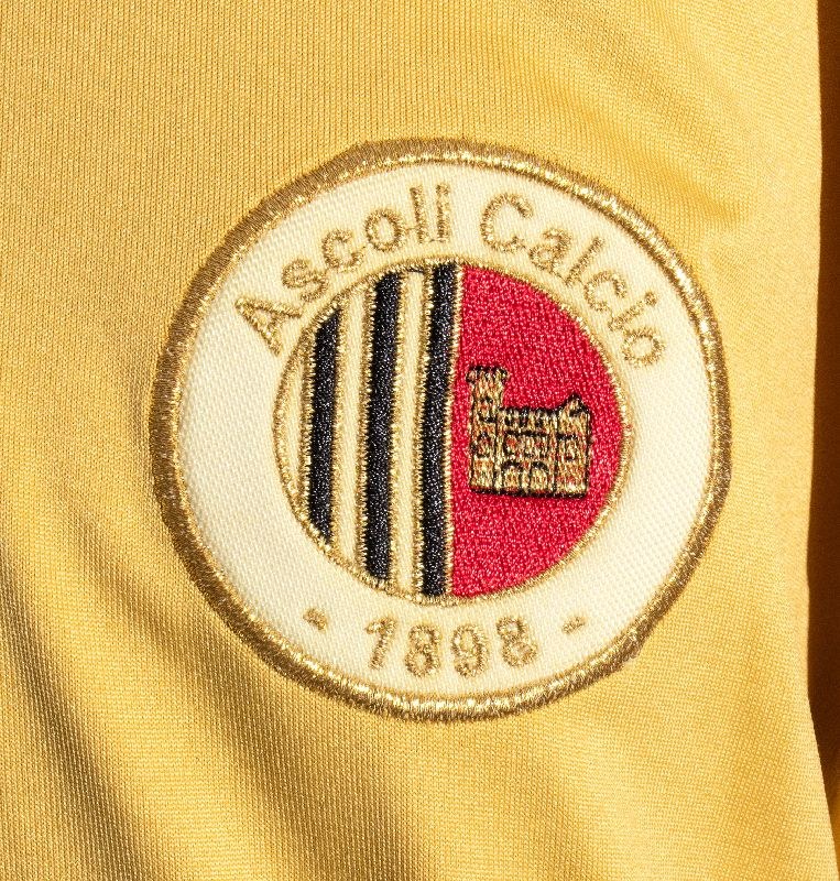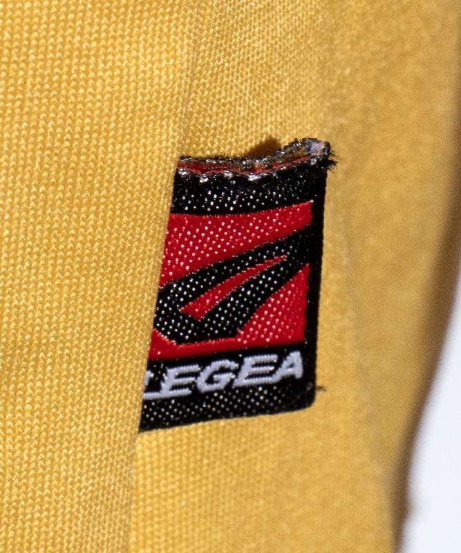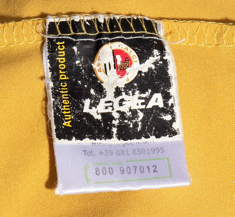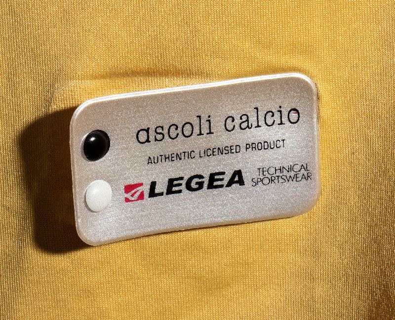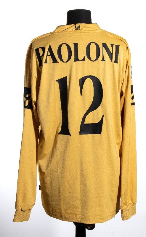 Long-sleeved match jersey, acrylic, LEGEA, Authentic Product ASCOLI CALCIO labels inside, size XLOn the front: embroidered LEGEA logo, printed FABIANPLASTIC, sewn-on ASCOLI CALCIO 1898 logo, CULT sponsor applied (detachment in some areas), "ASCOLI CALCIO - Authentic Licensed Product Legea" tag at the bottomOn the sleeves: sublimation logo; Left sleeve circular patch "LEGA CALCIO SERIE B "TIM"On the back: PAOLONI name and number 12 in sublimation, embroidered Ascoli city emblem on the collarMatch worn shirt from the 2007-2008 Serie B season by goalkeeper Marco PaoloniVery good conditionProvenance: Sports journalist, private collection, player certification
