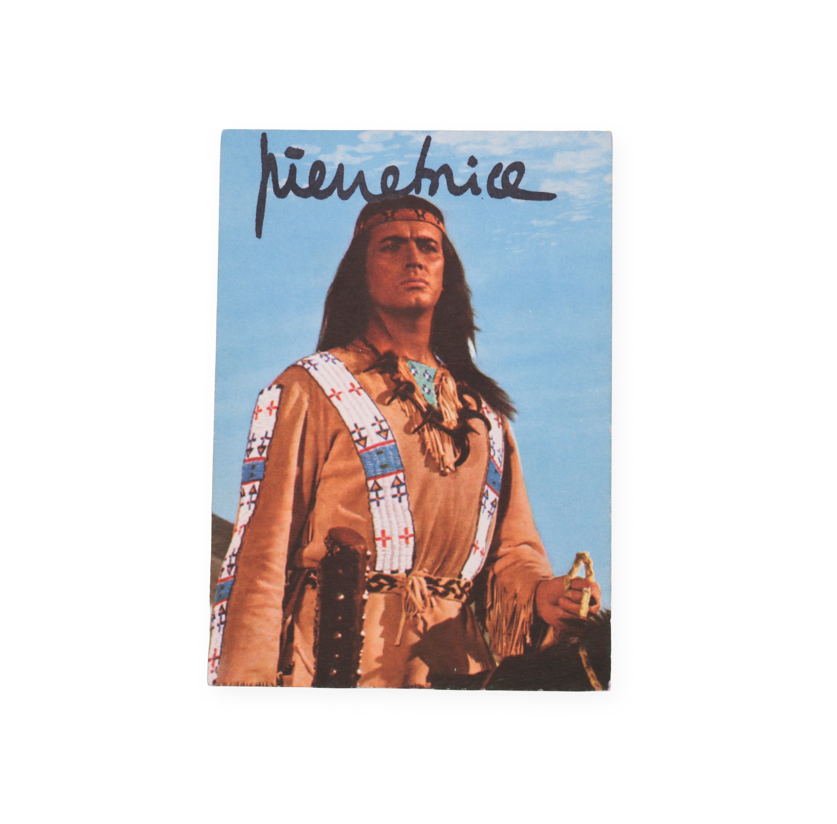 Pierre Brice's signature on a postcard with a photo of him as Vinnetou. Pierre Brice was a French actor who became famous for portraying an Apache chief in film adaptations of Karl May's novels. His charismatic performance and refined appearance made Vinnetou a cultural icon and Brice an international star beloved by generations of viewers.Bidders are obliged to inform themselves about the condition of the lots before the auction, subsequent complaints will not be taken into account.