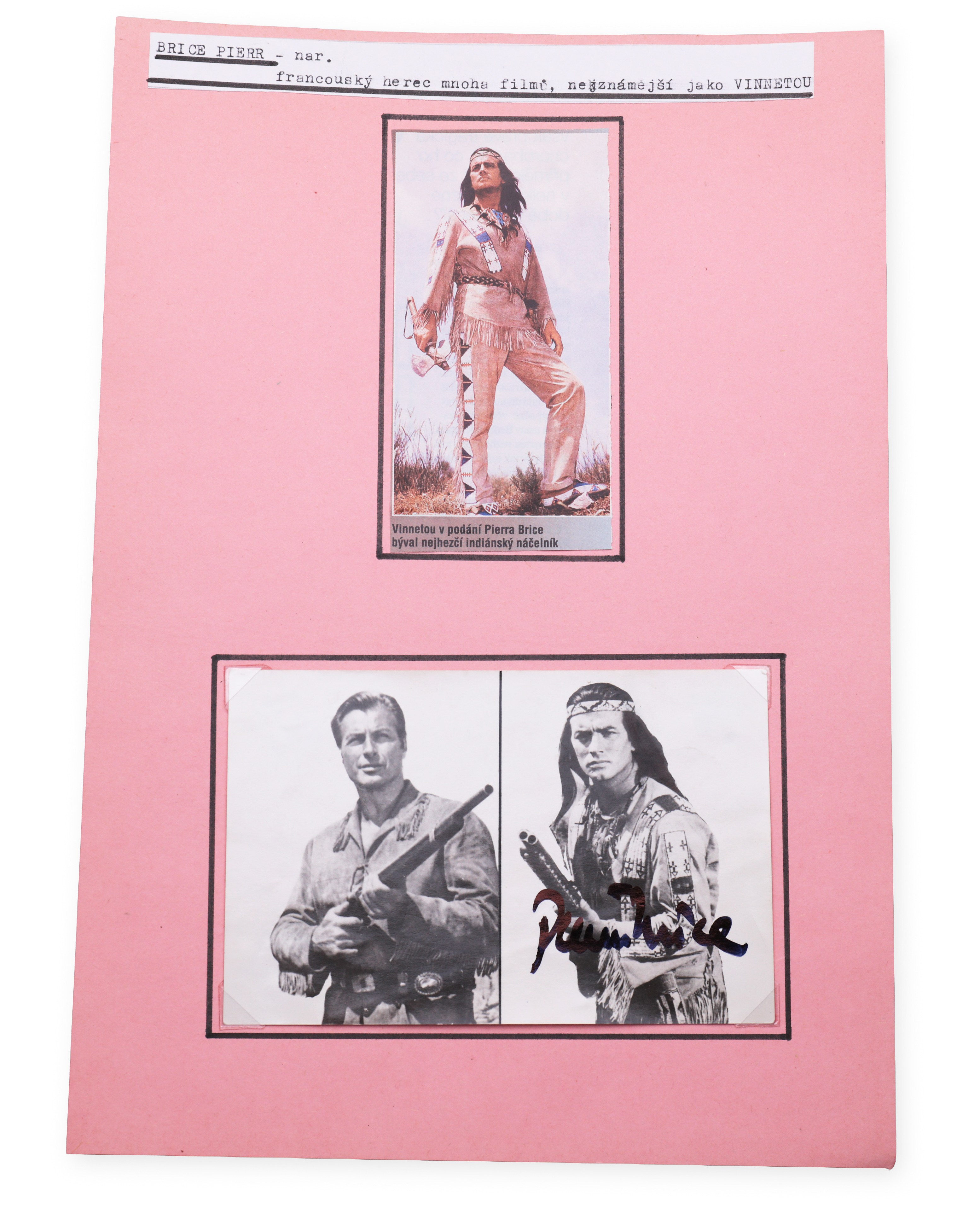 Signature of Pierre Brice on photograph placed on collector's sheet. Pierre Brice was a French actor best known for his role as the Apache chief Vinnetou in the popular film series based on the novels by Karl May. His portrayal of a noble Native American hero won generations of viewers in Europe. The autographed photo is a sought-after collectible associated with the adventure film icon.Bidders are obliged to inform themselves about the condition of the lots before the auction, subsequent complaints will not be taken into account.