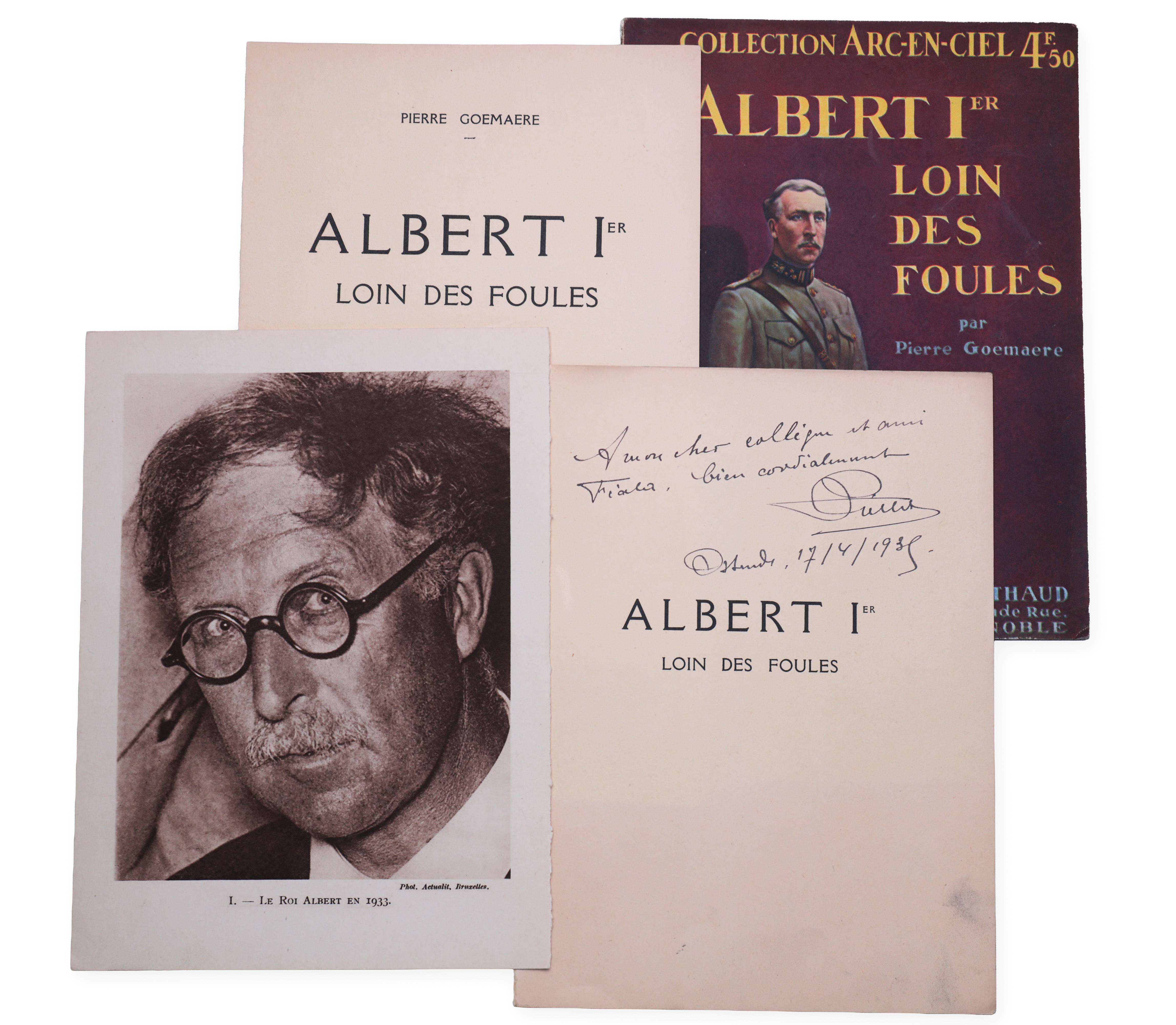 Pierre Goemaere – Belgian writer, historian and journalist. Signature with dedication and date 17 April 1938 on a page from the book "Albert 1er - Loin Des Foules", an authentic document related to his literary and journalistic activities.Bidders are obliged to inform themselves about the condition of the lots before the auction, subsequent complaints will not be taken into account.