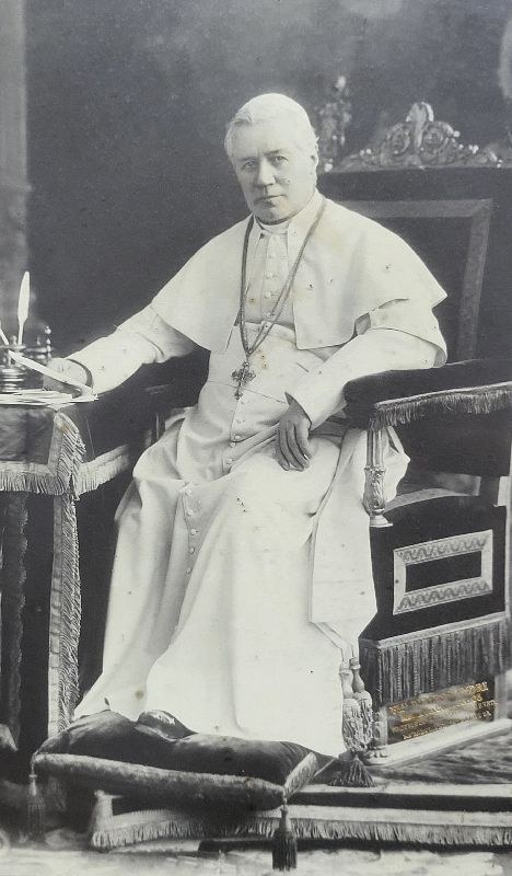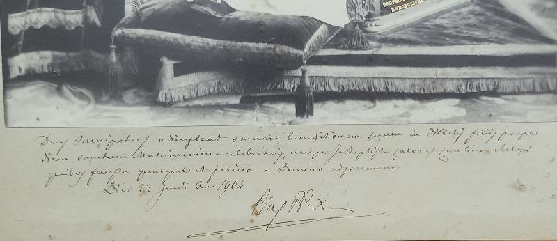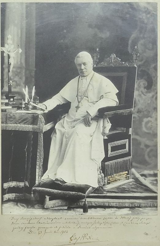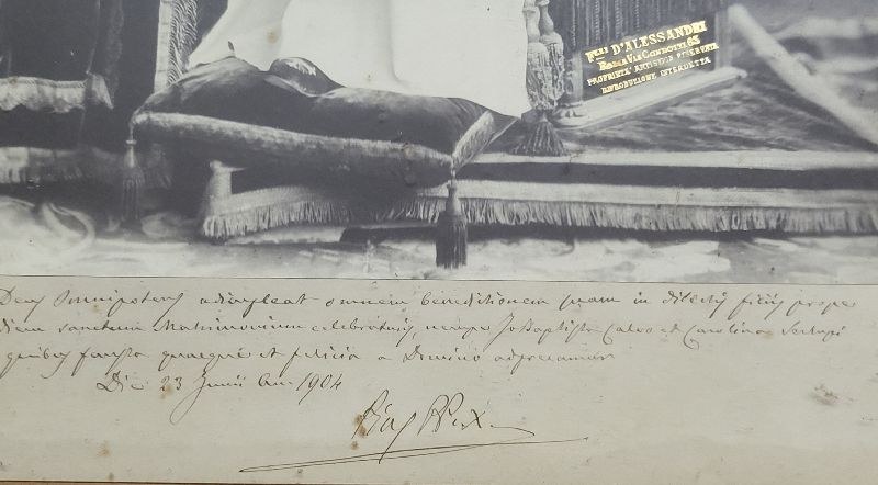 Photograph, b/w, Pope Pius X (Pius PP. X, born Giuseppe Melchiorre Sarto; Riese, June 2, 1835 – Rome, August 20, 1914) with a dedication and blessing written in Latin for the married couple, and the Holy Father's handwritten signature.Dated June 23, 1904.Dedication and signature handwritten in black ink. The official photo is stamped by F.LLI D'ALESSANDRI - Rome, Via Condotti, mounted on cardboard and in a contemporary frame.Large size, approximately 29 x 43 cm, with frame 53 x 70 cm.