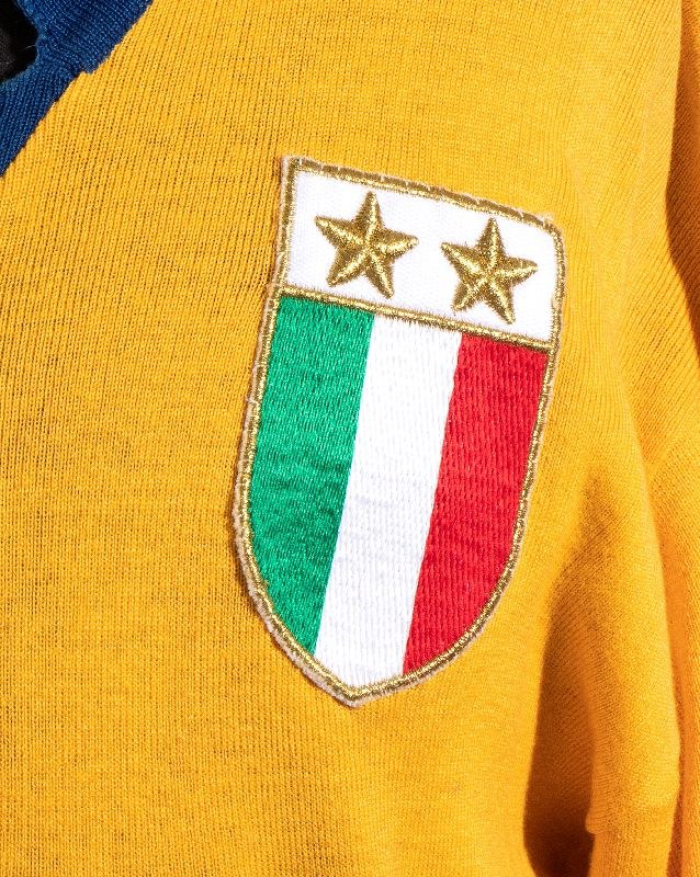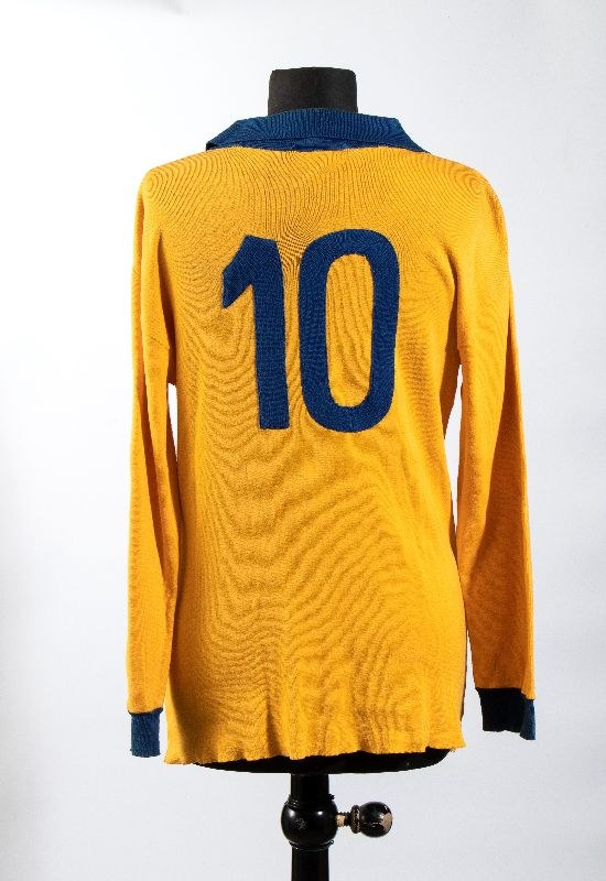 Long-sleeved away jersey, yellow with blue cuffs and collar, made of cotton or heavy acrylic. Remnants of the label on the inside collar. Estimated size LOn the front: ARISTON sponsor embroidered in blue (small characters, approximately 37 mm high), KAPPA technical sponsor embroidered in appliqué, and the Italian tricolor shield with two stars embroidered on the chest.On the back: number 10 sewn on.Attributed to Michel Platini, 1984-85 seasonIn excellent condition, with minor signs of wear on the cuffs.Provenance: Sports journalist, private collection