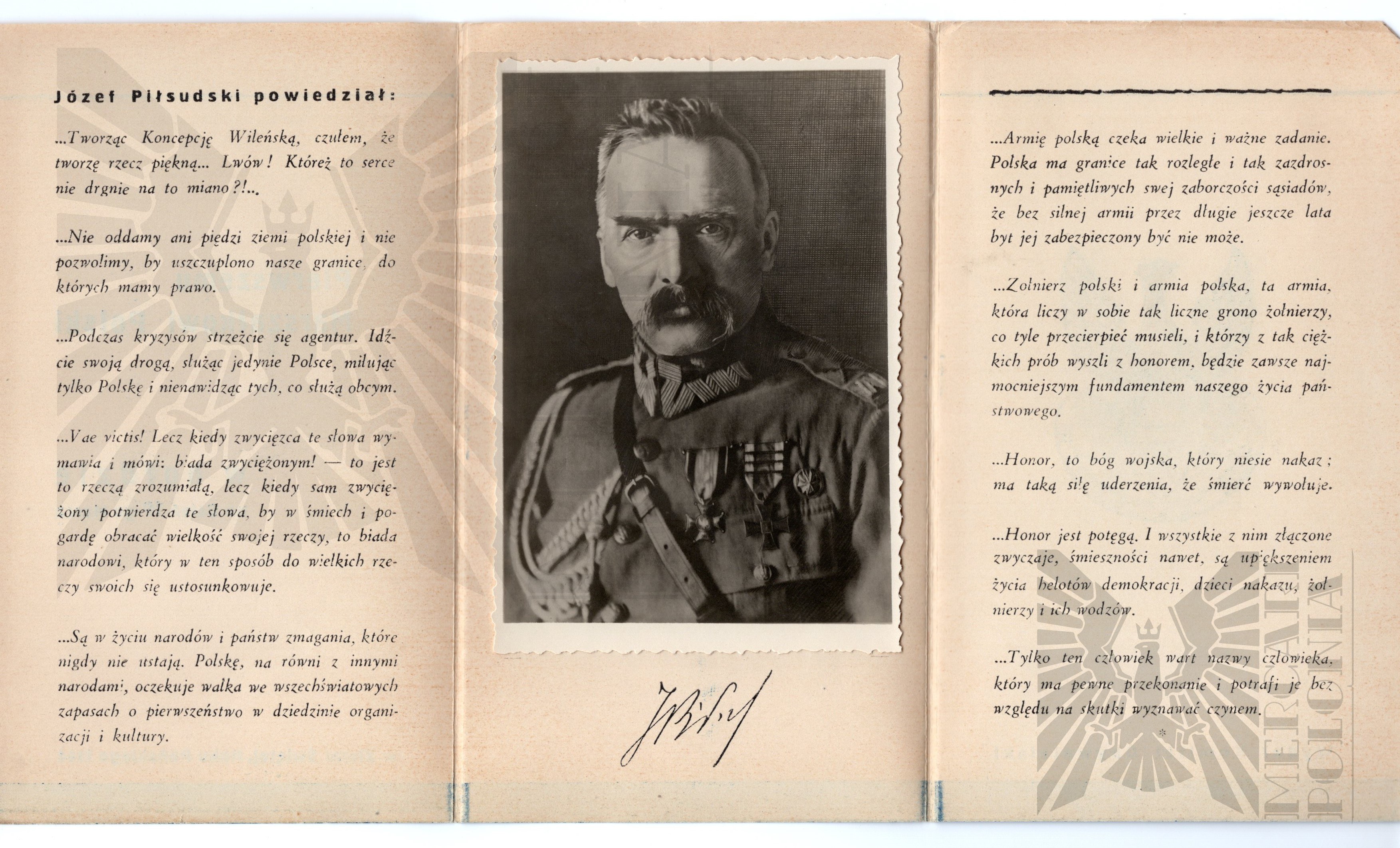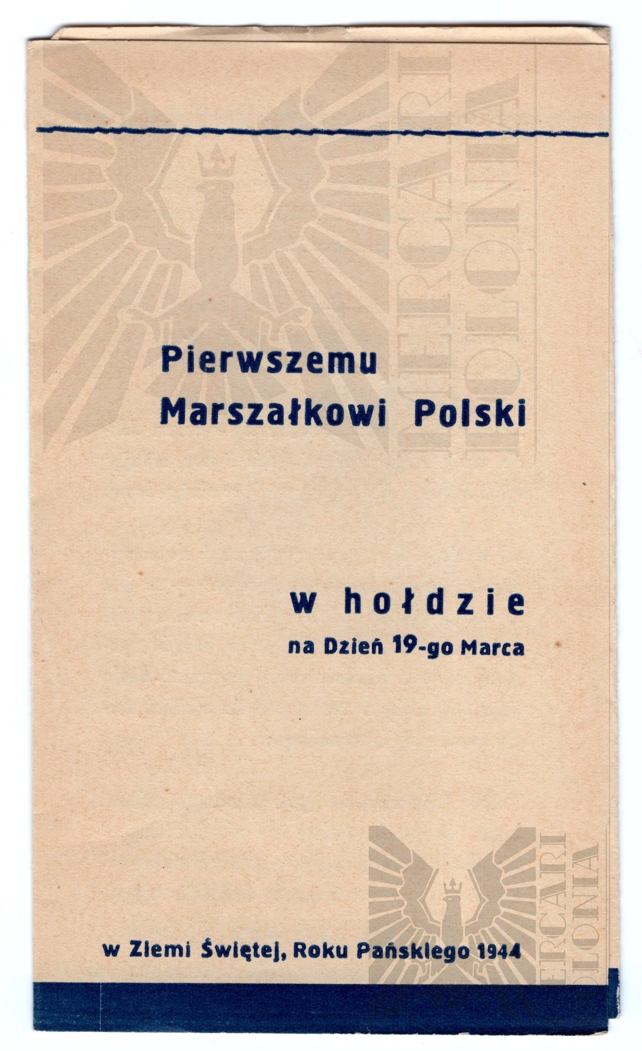 Ulotka z Ziemi Świętej z roku 1944, (Pierwszemu Marszałkowi Polski W Hołdzie na Dzień 19 - go Marca), Wewnątrz zdjęcie Marszałka Józefa Piłsudskiego.