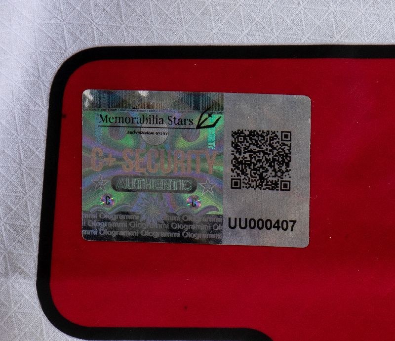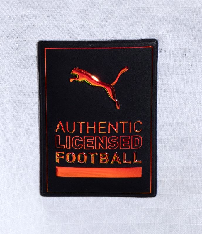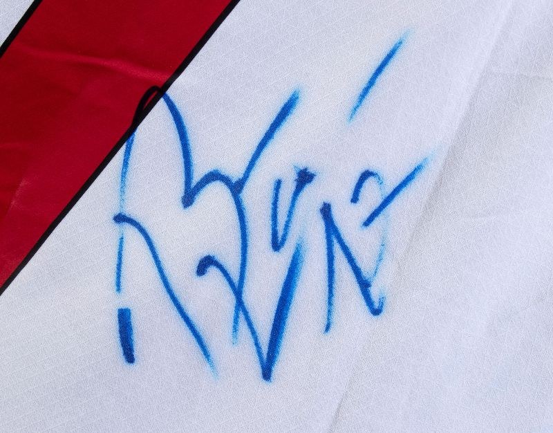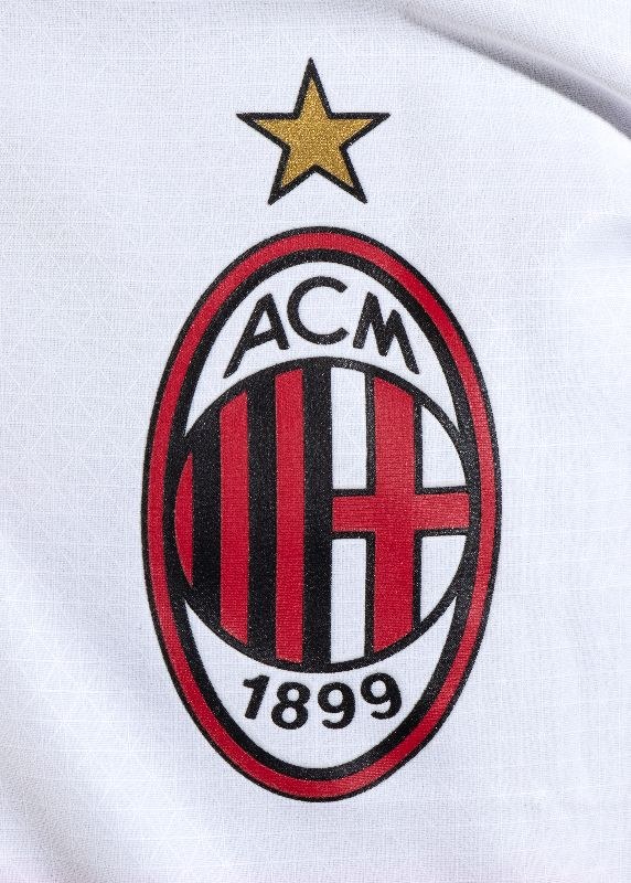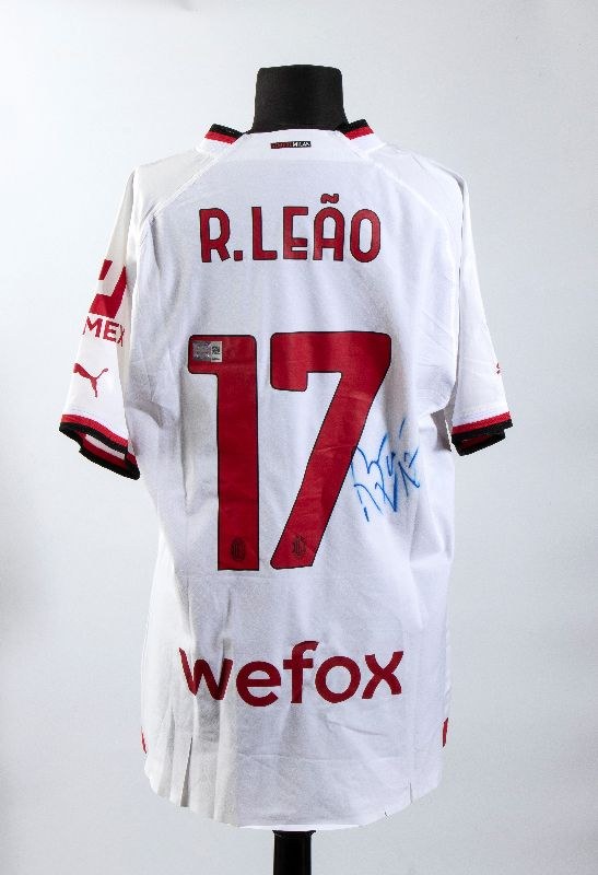 Away short-sleeved jersey, ULTRAWEAVE jersey, white with red and black trim, inner left shoulder label (Made in Indonesia / Style No. 765832-02 04/30/22 AD TL0MDH8300284), size LSEMPRE MILAN logo on the back collar. The jersey also features the AUTHENTIC LICENSED FOOTBALL patch.On the front: EMIRATES FLY BETTER sponsor, PUMA logo, ACM 1899 logo with gold sublimation star, tricolor shield in the center, sublimation with raised wavy details.On the sleeves: PUMA logo and BIT MEX sponsor, sublimation, embossed rubber SERIE A TIM patch on the right sleeve.On the back: number 17, name R. LEAO, and sponsor WEFOX at the bottom, sublimation. Original autograph by Rafa Leao in blue ink next to the number 7. A chromatic sticker with QR code for authenticity from MEMORABILIA STARS is applied to the number 1.Issued/worn jersey, from stock for Rafa Leao, 2022-23 season, in perfect condition.Provenance: Sports journalist, private collection