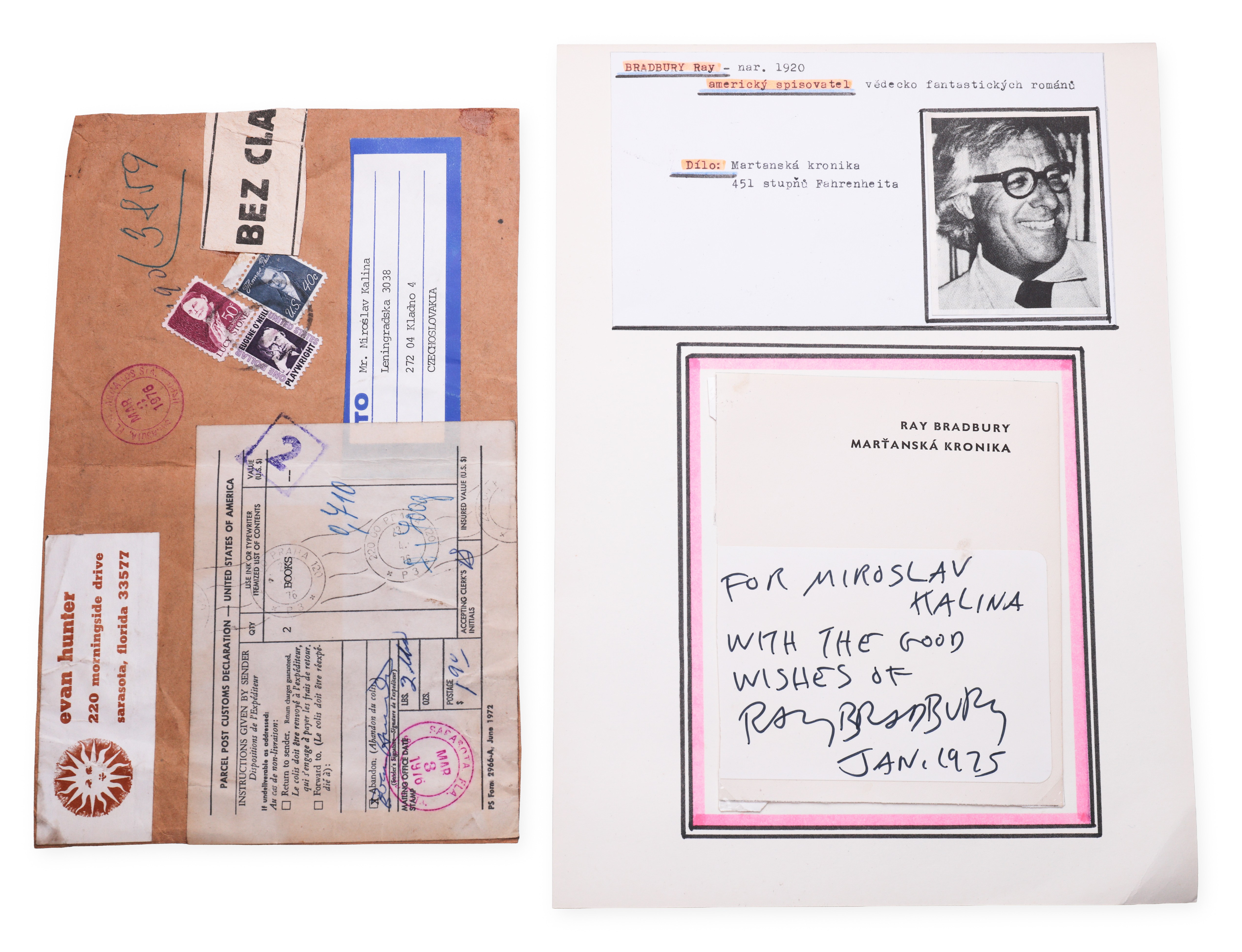 A leaf cut from a book with a dedication and signature of the famous American writer Ray Bradbury, author of the works: "Fahrenheit 451" or "The Martian Chronicle" is attached to the collector's sheet. The original envelope in which the letter was sent is also included. The signature is written in ink and is legible. An attractive item for collectors of literary autographs and memorabilia associated with world science fiction classics.Bidders are obliged to inform themselves about the condition of the lots before the auction, subsequent complaints will not be taken into account.