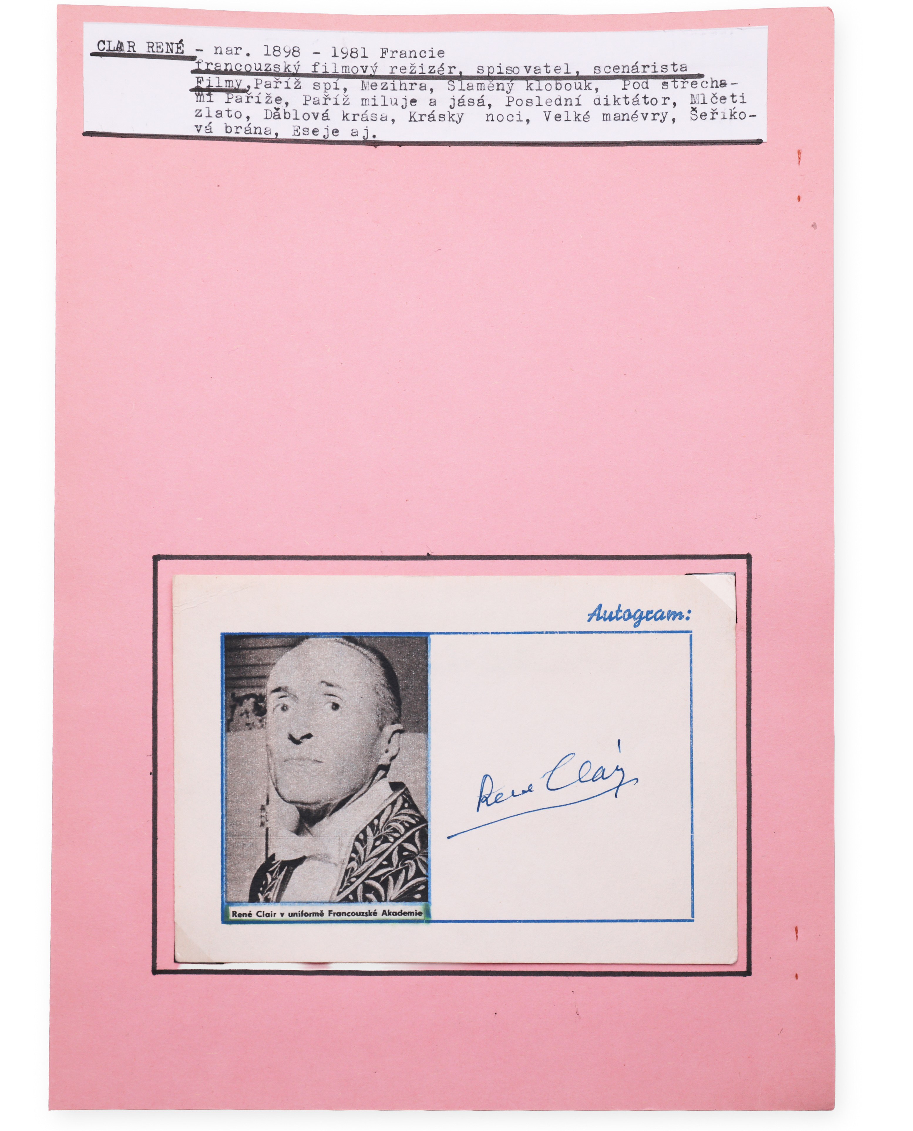 René Clair's signature on a card with a pasted photo, placed on a collector's sheet. René Clair was an important French film director, screenwriter and writer who became famous mainly during the period of the interwar avant-garde and early sound film. Among his most famous works are films such as "Under the Roofs of Paris" or "Million". His signature represents a valuable collector's item associated with a classic of world cinema.Bidders are obliged to inform themselves about the condition of the lots before the auction, subsequent complaints will not be taken into account.
