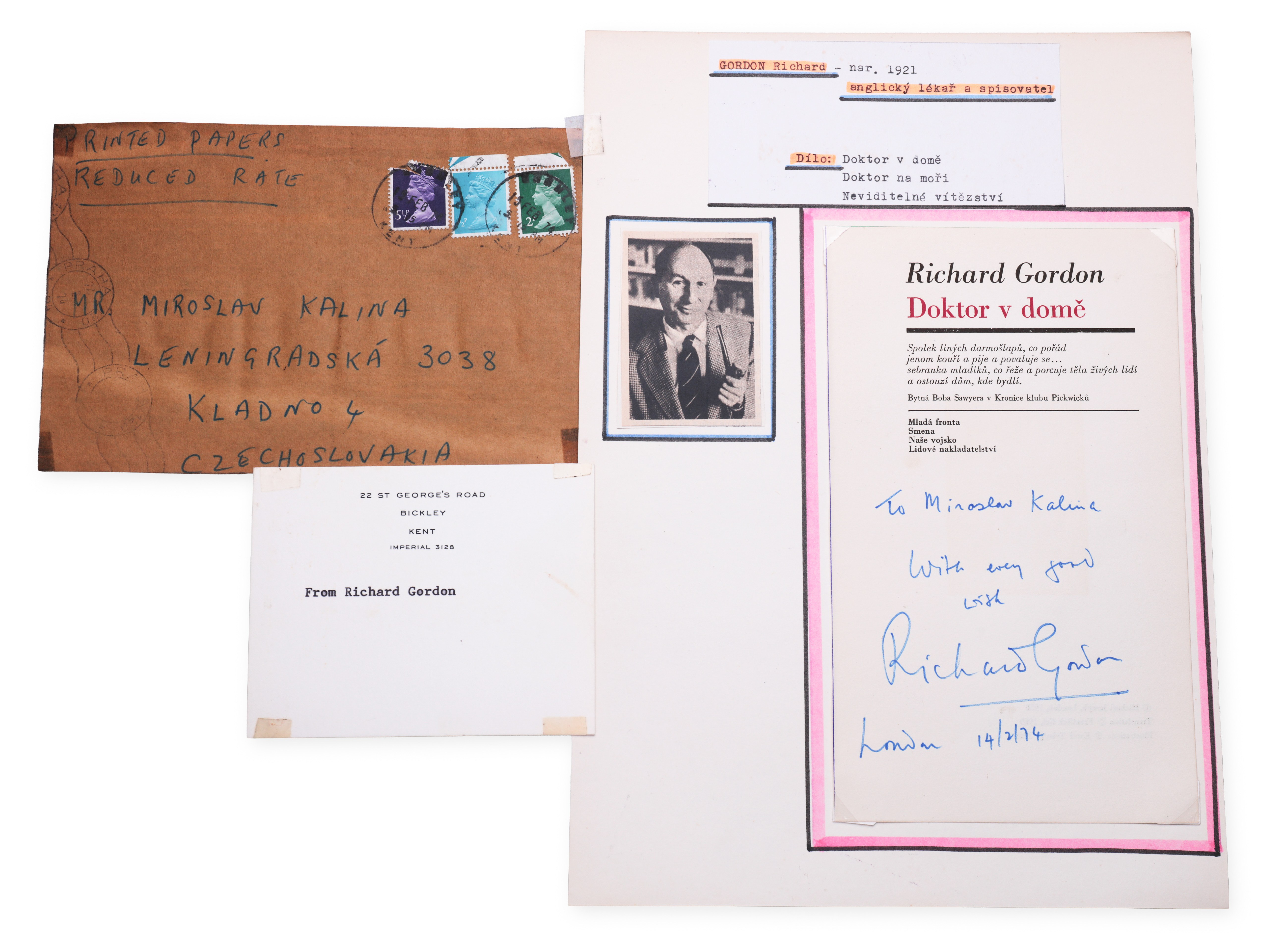 Richard Gordon's signature on a leaf from the book "Doctor in the House" with a personal dedication dated 14th February 1974, complete with cover affixed to collector's leaf. Richard Gordon (1921–2017) was a British writer and physician, famous for the series of humorous novels "Doctor in the House" and their film adaptations. His works combine the medical setting with lightness and wit, making him one of the most popular writers of British post-war humorous prose.Bidders are obliged to inform themselves about the condition of the lots before the auction, subsequent complaints will not be taken into account.
